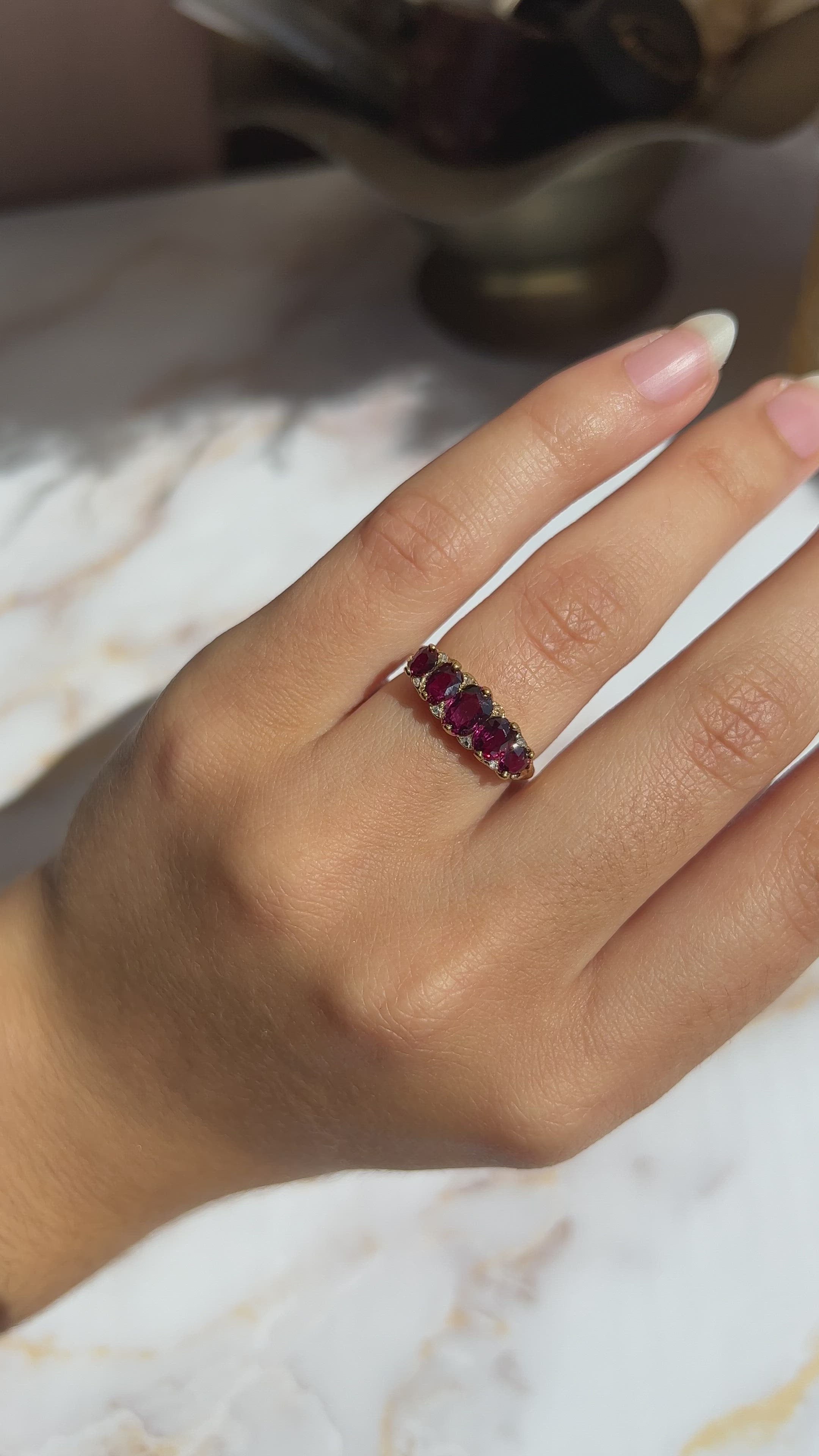 An absolutely stunning antique piece that shows hallmarks for both 1861 and 1897 (Victorian either way!). These deep rubies span the finger so beautifully in the perfectly crafted antique piece.