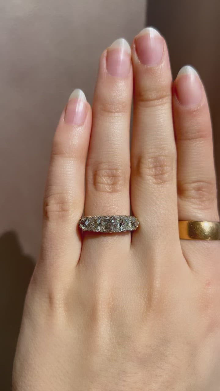 The Bristol ring is an authentic vintage diamond ring from the Late Victorian Era circa 1890. The ring features 5 old mine cut diamonds of approximately J-K-L color, VS-SI clarity that combine for approximately 2.05 carats. Eight small rose cut diamonds are set in silver between the diamonds. The stones are set in an 18 karat yellow gold setting. The ring is currently size 8 and can be resized!