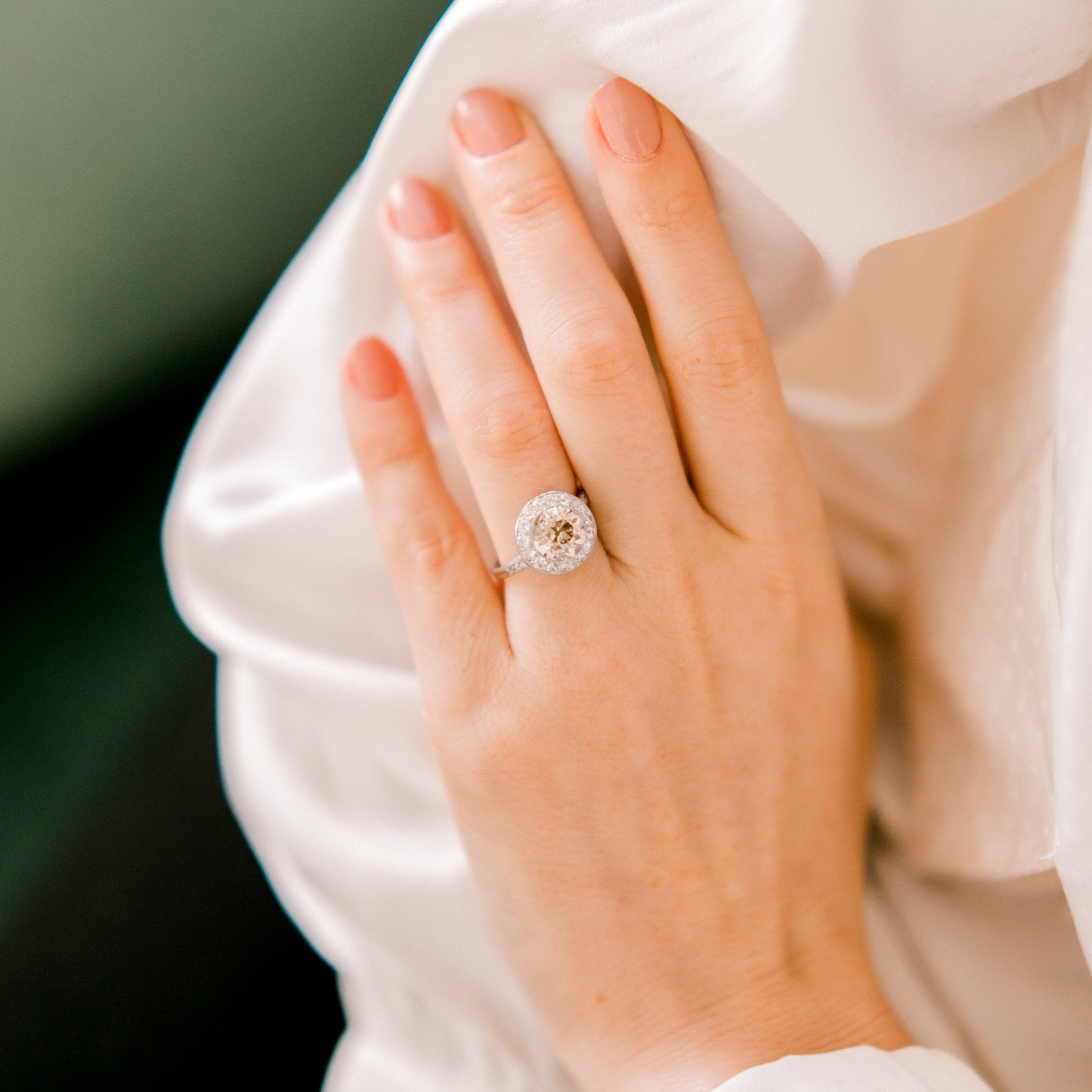 The color of the center diamond is so delectable! So many hues that show up in all different lighting! The contrast of the very white diamonds in the halo creates a beautiful look! Low profile with the daintiest details makes for a dreamy ring!