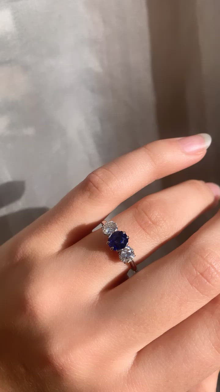 The Moe ring is an authentic vintage three stone engagement ring from the Art Deco era! The ring centers an AGL certified no-heat Burmese oval natural Sapphire that is approximately 1.15 carats. To each side is an old European cut diamond of approximately 0.40 carats and I-J color, VS clarity. The stones are prong set into a platinum setting. The ring is currently size 7 and can be resized!