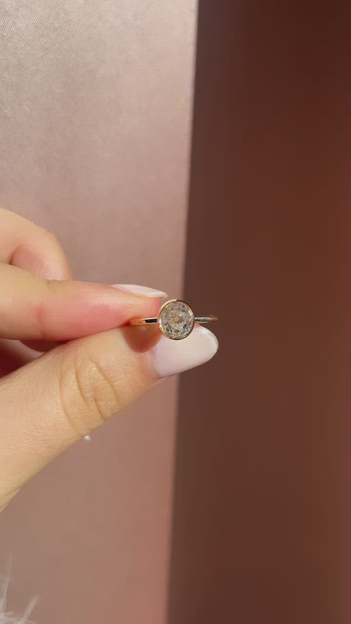 The Cabernet 1.35 ring is a VB original design made right here in NYC. The ring centers a GIA certified 1.35-carat old mine cut diamond of L color, SI1 clarity. The stone is bezel-set in an 18 karat yellow gold setting. The ring is currently size 6 and can be resized!