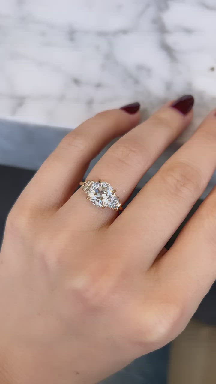 The Camille 2.88 ring is a VB original design made right here in NYC. The ring centers a GIA-certified 2.88-carat old mine cut diamond of K color, VS2 clarity. The center stone is set in a 4 prong 18kt yellow gold setting. Three flanking diamond baguettes are set to either side of the center stone, all combining for approximately 0.30 carats. The ring is currently size 6 and can be resized!