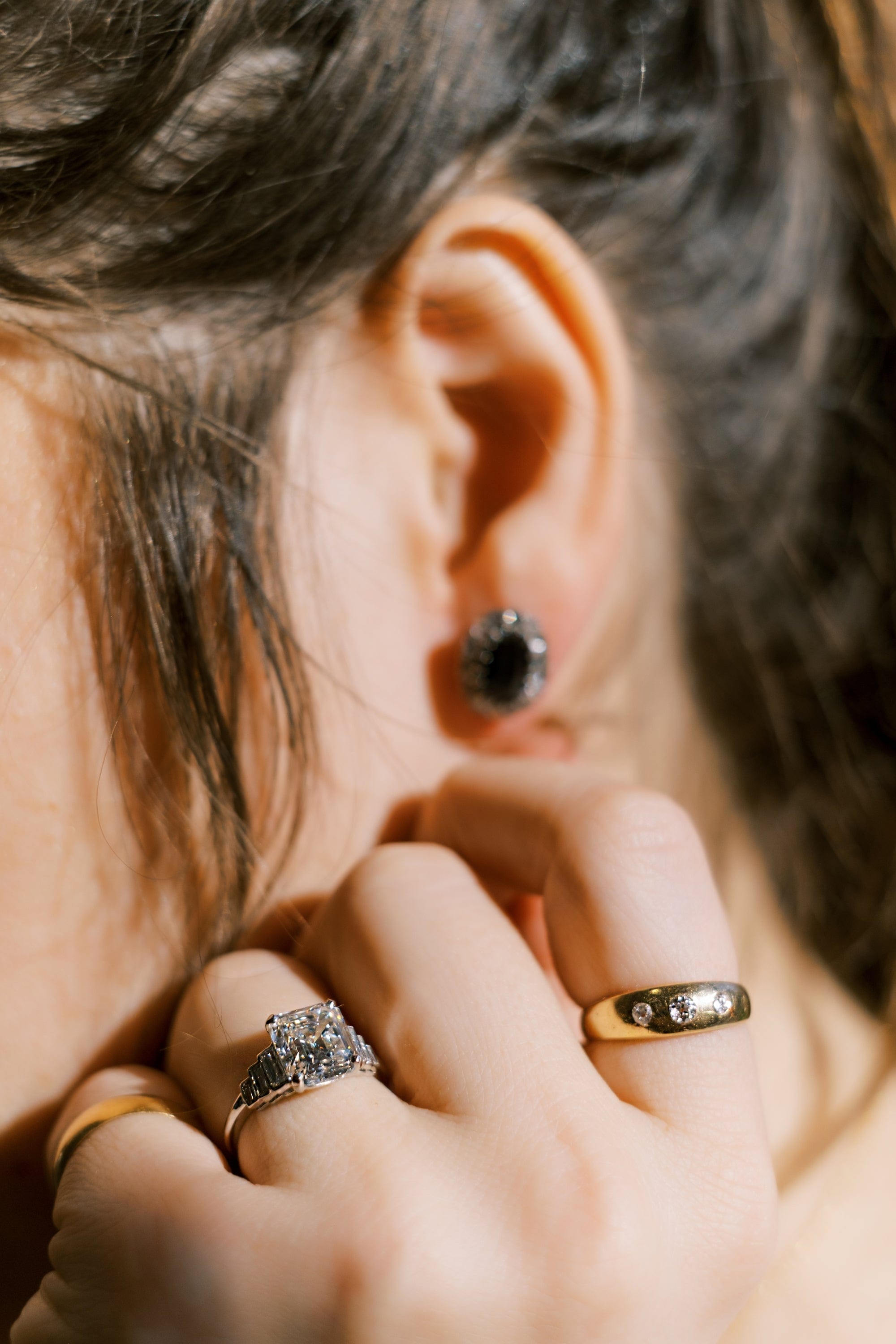 We were so excited when we came across this diamond! This jaw dropping antique Emerald cut diamond is a rare find and pairs perfectly with the side baguettes to give a low profile full finger spread with an Art Deco feel.