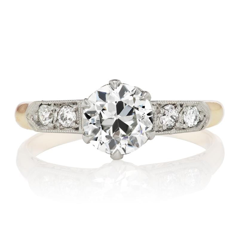 What's interesting about this diamond is that it looks white in most lighting but here and there you can catch the faintest glimpse of green. The gallery of the ring has original hand engravings making this ring interesting from every angle. This vintage piece is perfect for someone who wants a solitaire that's a bit more unique.