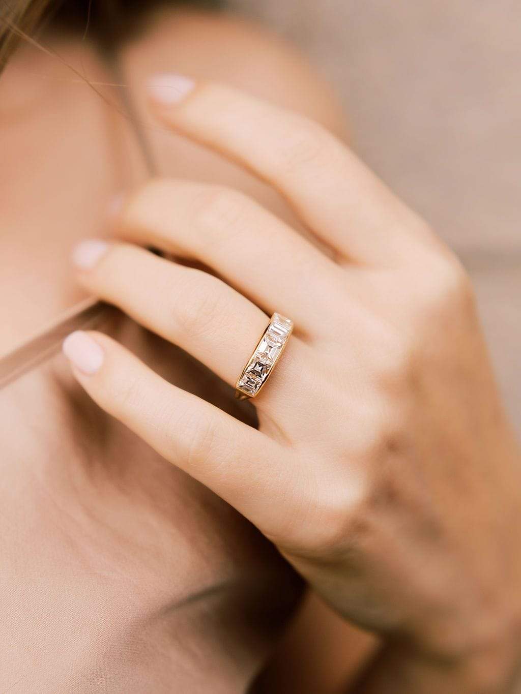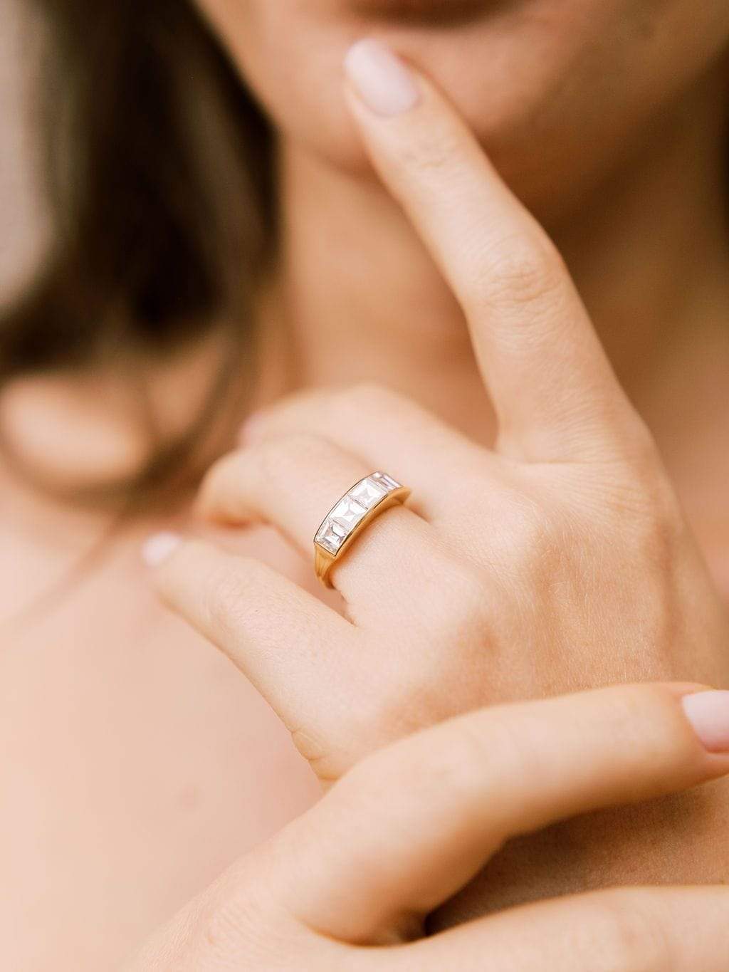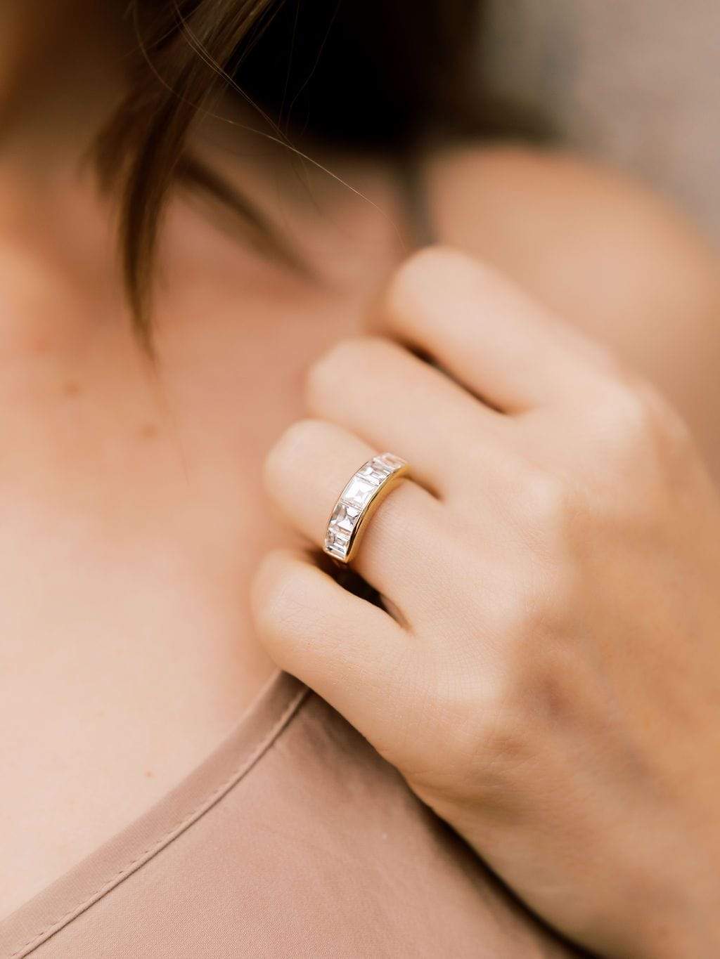 The diamonds in this band are stunning. A unique and bold shine set in a sleek golden setting that wraps the finger beautifully.