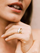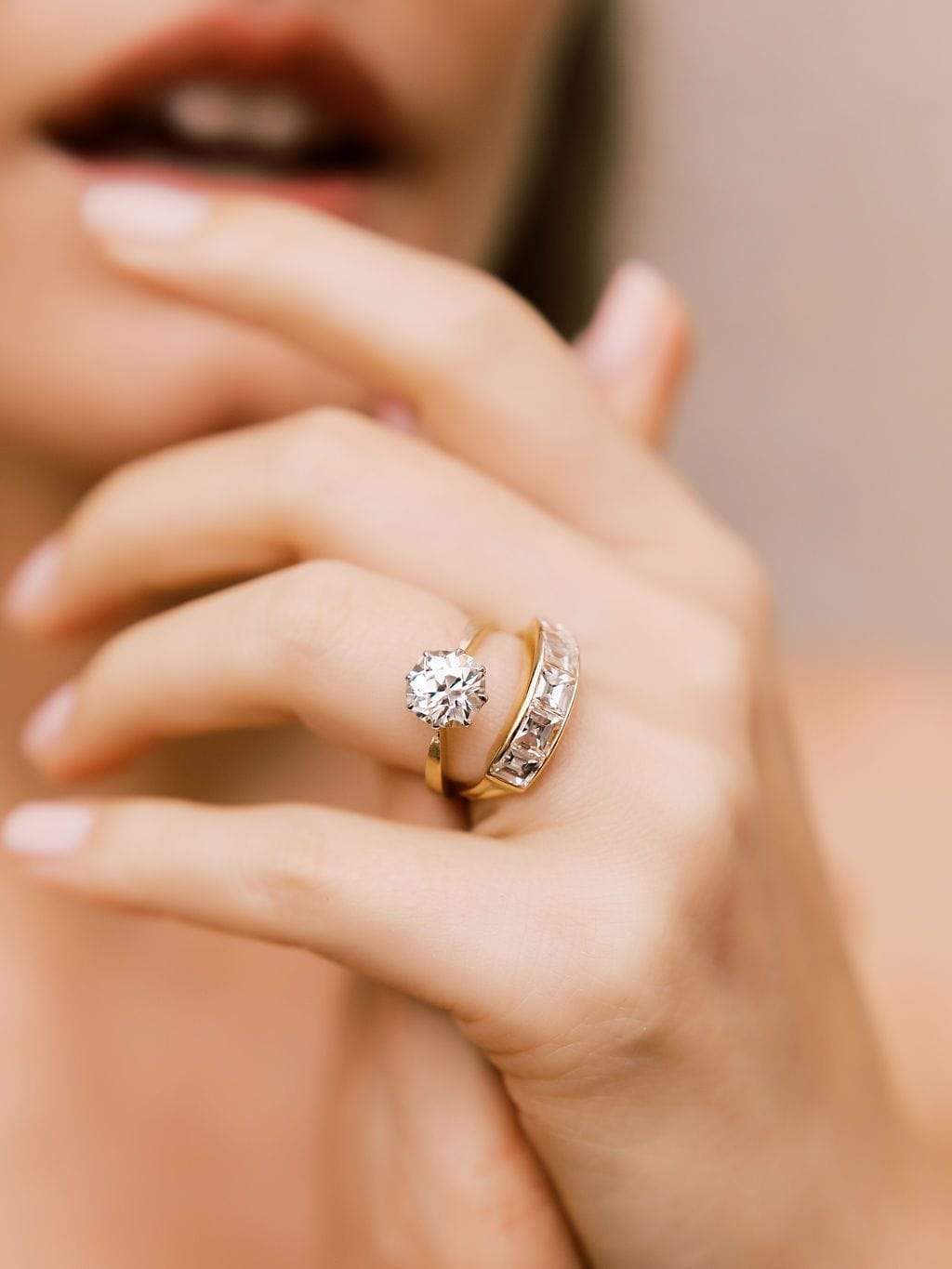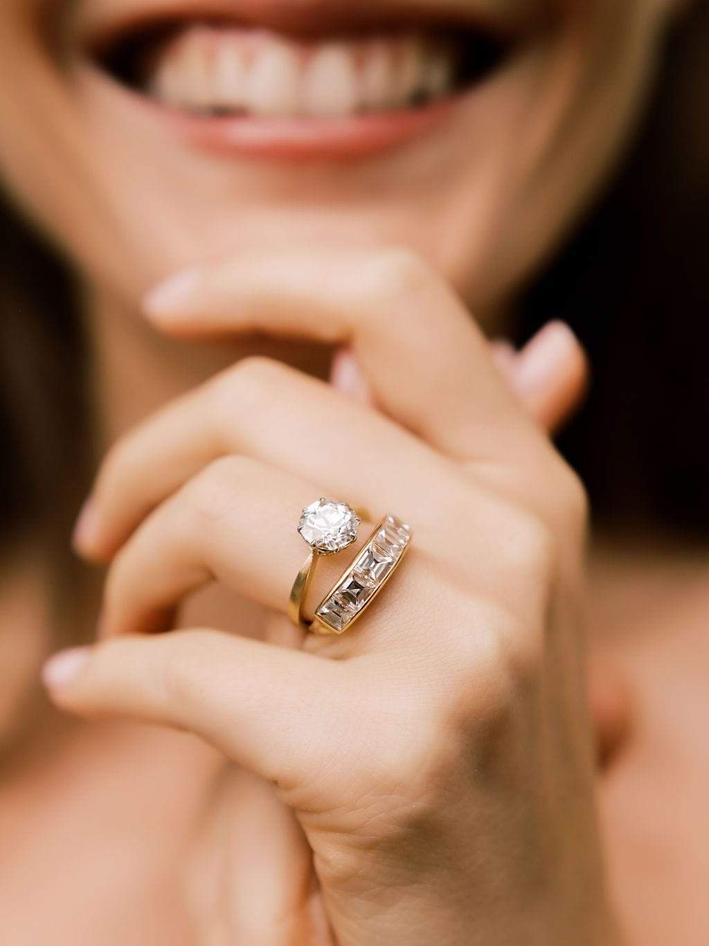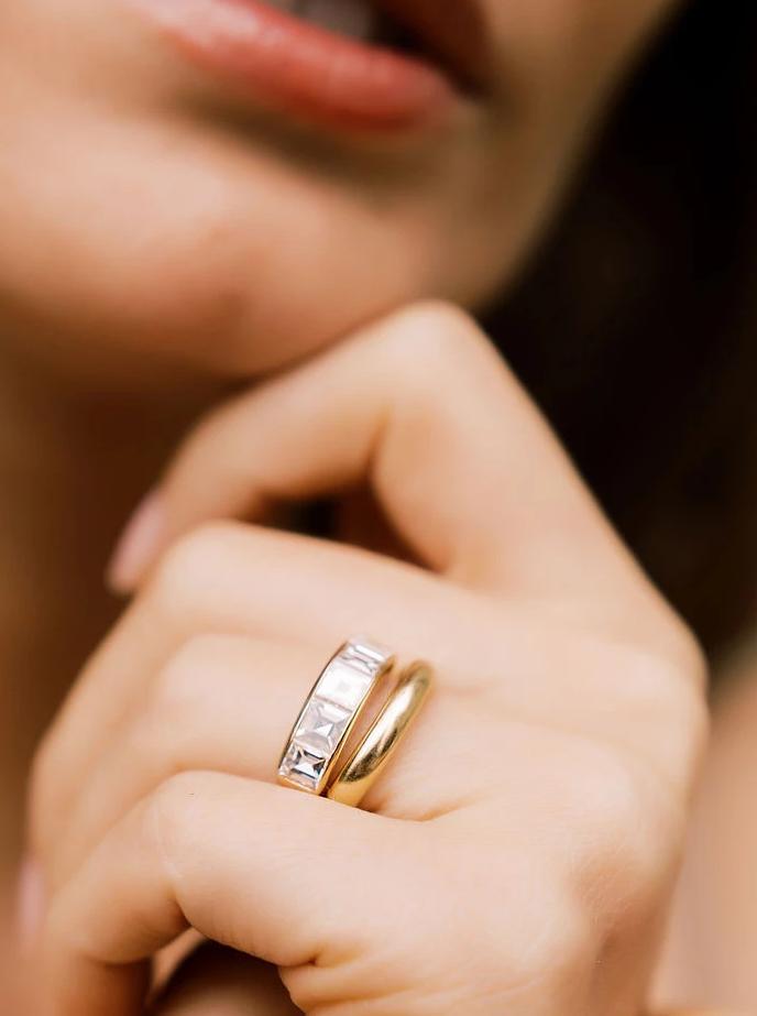 The diamonds in this band are stunning. A unique and bold shine set in a sleek golden setting that wraps the finger beautifully.