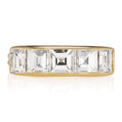 The Duchess 2.29 band is a VB-made band! This band features 5 Carré cut diamonds that are channel set in an 18kt yellow gold setting. The diamonds combine for 2.29 carats of approximately F-G color, VS clarity. The shank has delicate fluting. The ring is currently size 5 and can be resized!