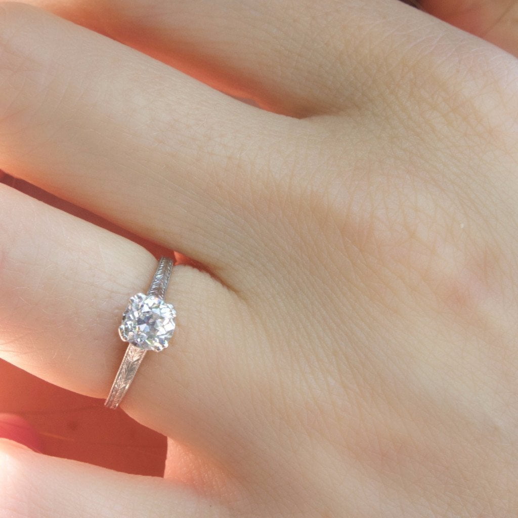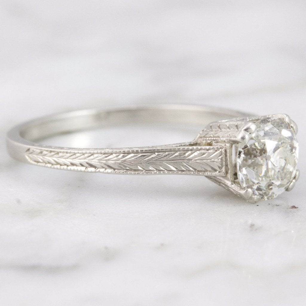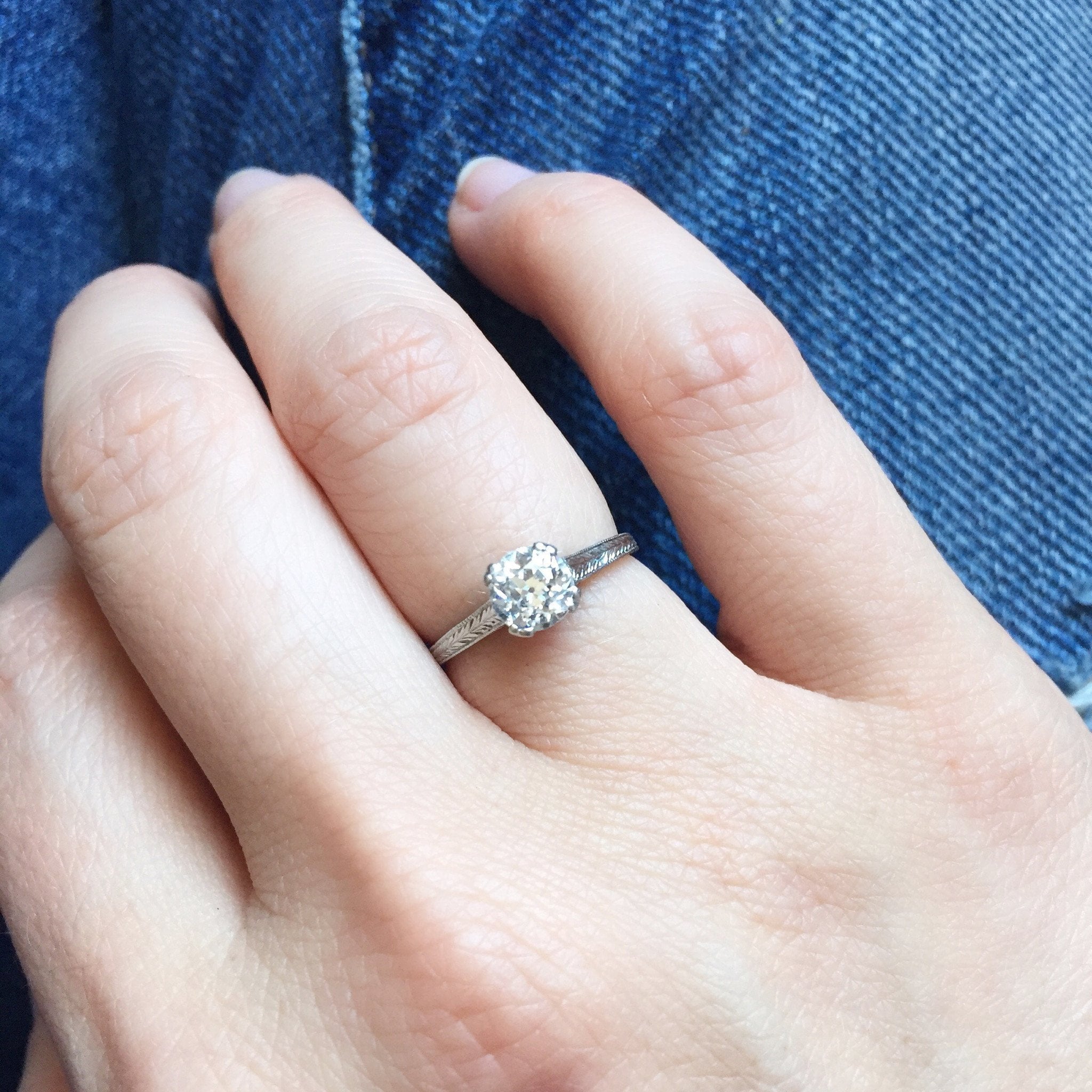 The Cecilia Vintage Engagement Ring is a lovely Edwardian piece. The ring centers an Old European Cut diamond approximately 0.68 carats G-H color and I1 clarity. The diamond is held in a 4 prong platinum setting with delicate engravings down the prongs, around the diamond and half way down the shank. The ring is a size 5 and can be resized.