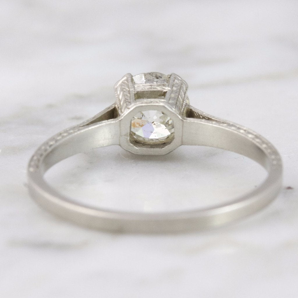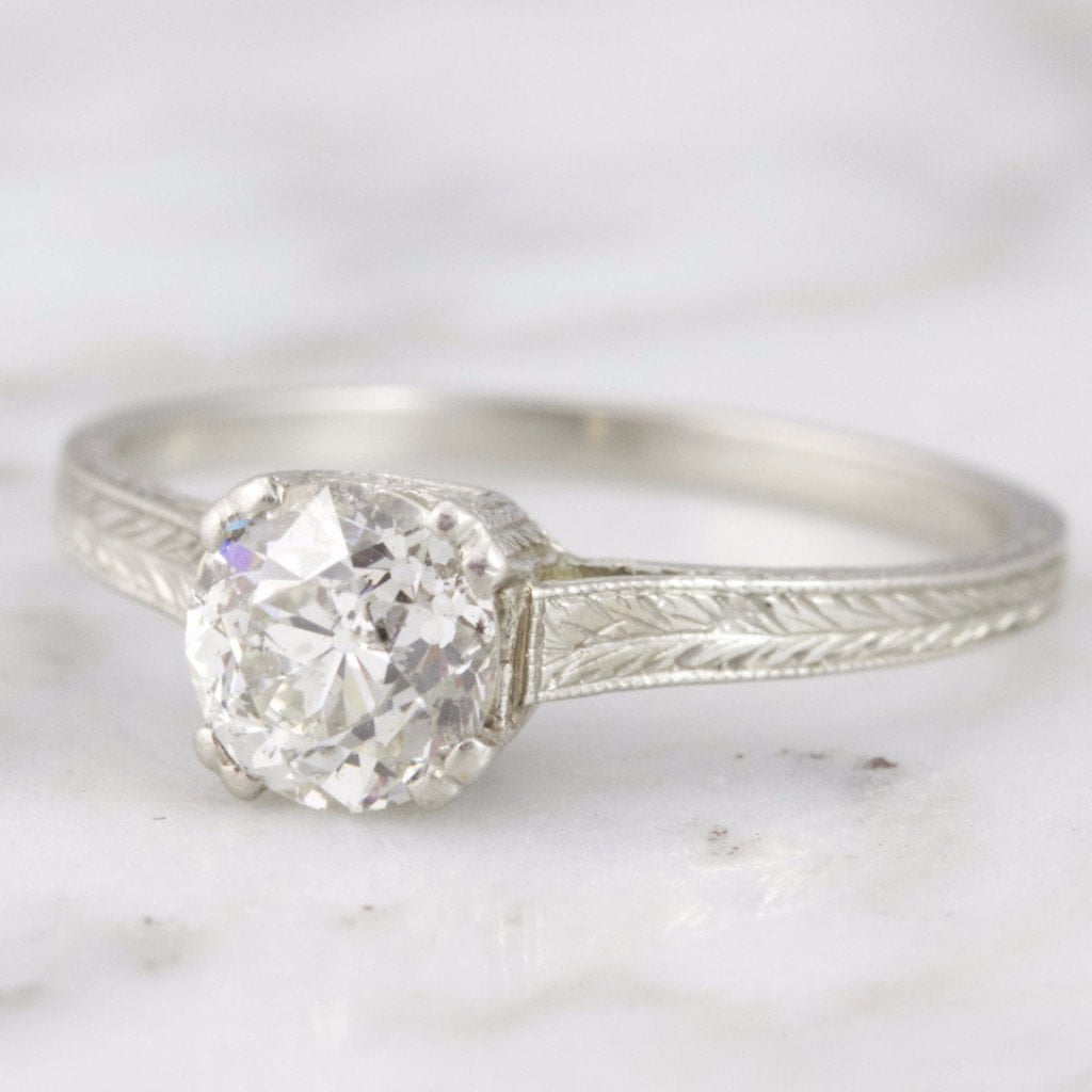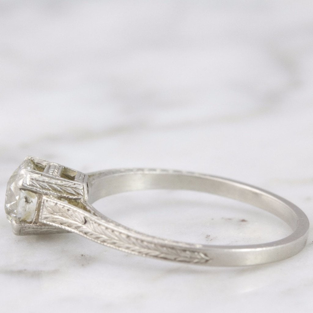The Cecilia Vintage Engagement Ring is a lovely Edwardian piece. The ring centers an Old European Cut diamond approximately 0.68 carats G-H color and I1 clarity. The diamond is held in a 4 prong platinum setting with delicate engravings down the prongs, around the diamond and half way down the shank. The ring is a size 5 and can be resized.