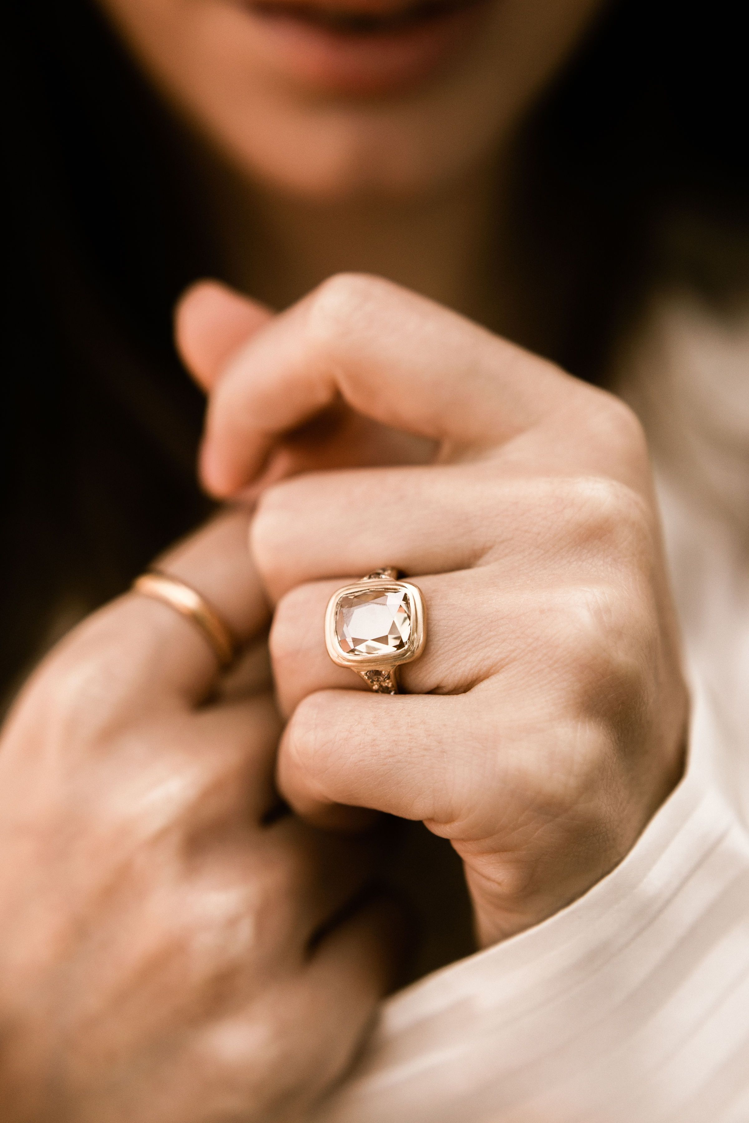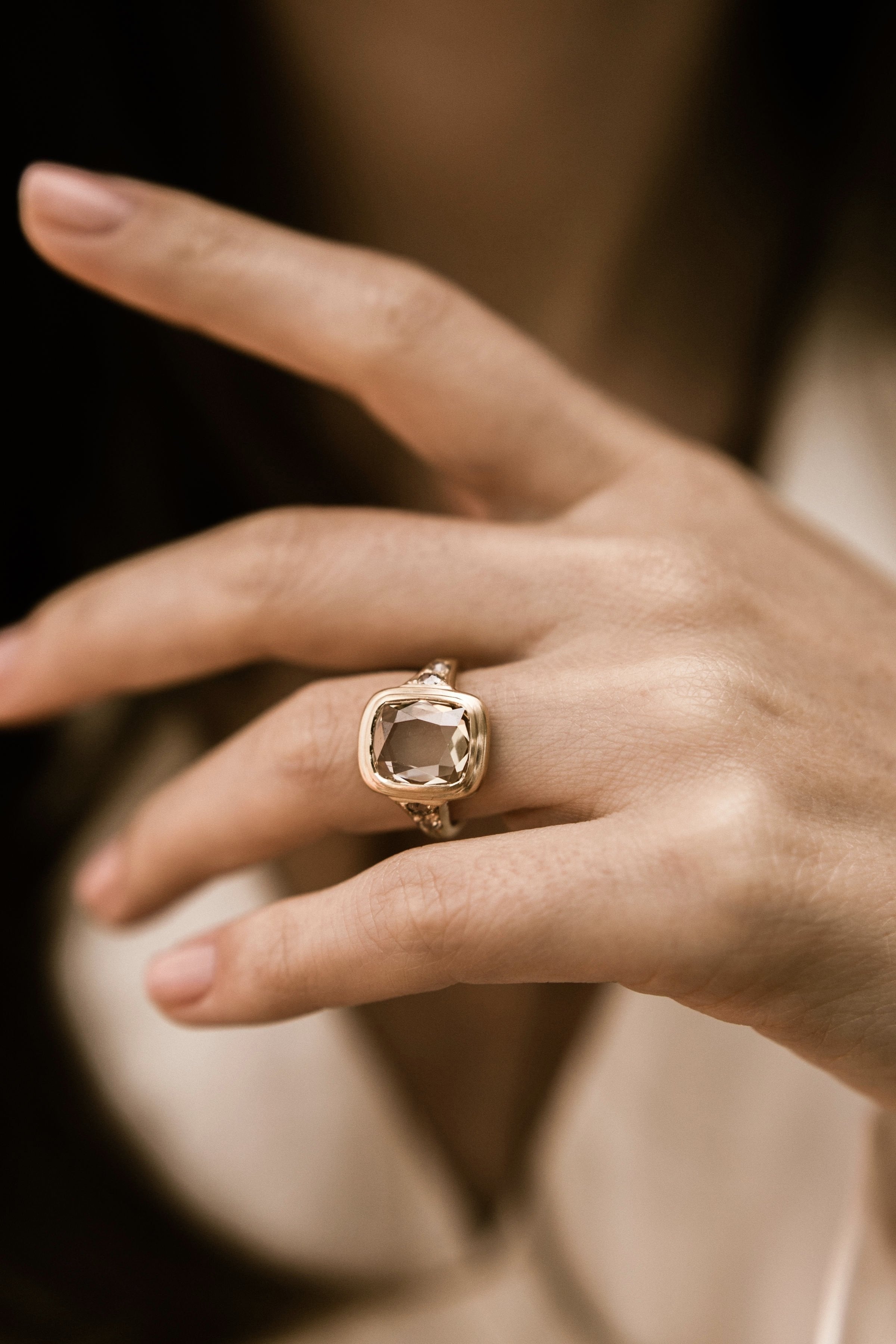 The Chartreuse Ring is a VB-made Vintage-Inspired Engagement ring with authentically antique diamonds! This champagne colored diamond engagement ring centers a GIA Certified 2.70 carat Cushion Shape Rose Cut diamond of Natural Fancy Light Yellowish Brown color, SI1 clarity. The diamond is bezel-set in an 18kt yellow gold setting with two champagne-colored old European cut diamonds to each side. The ring is size 6 and can be resized!