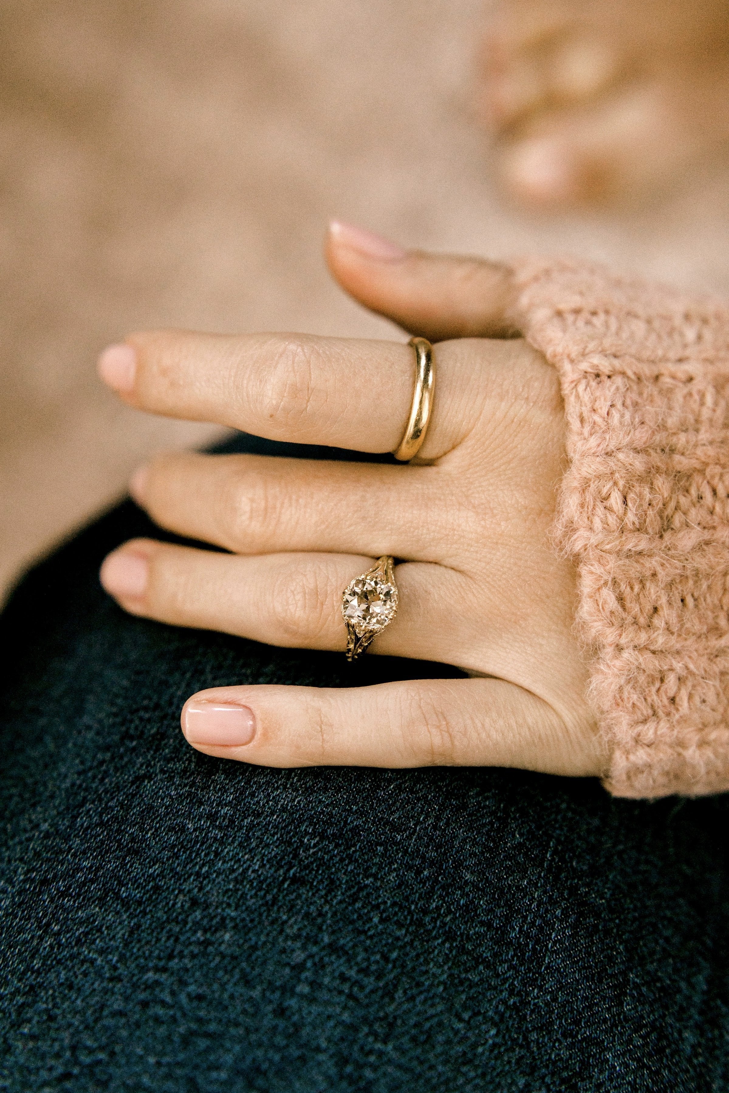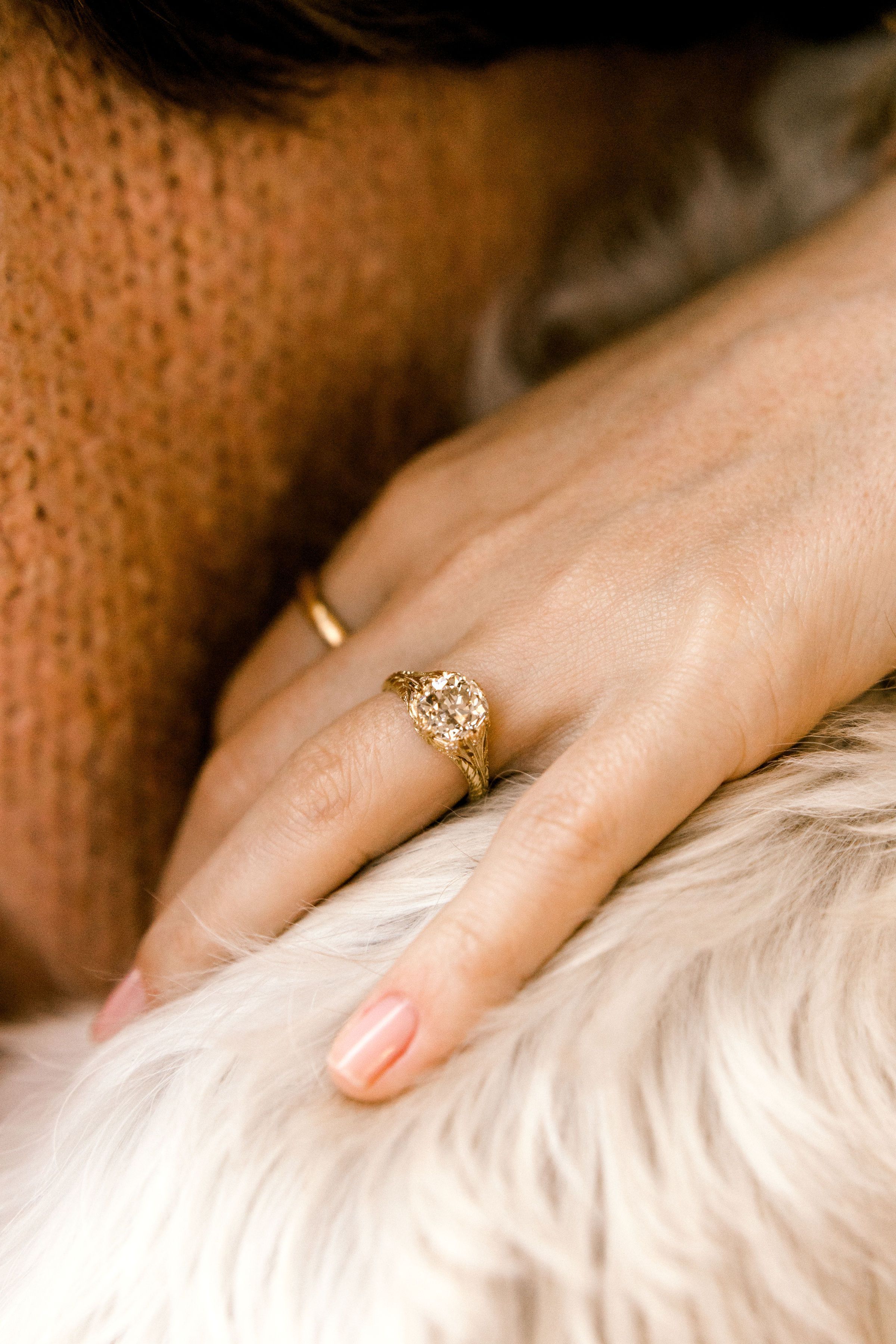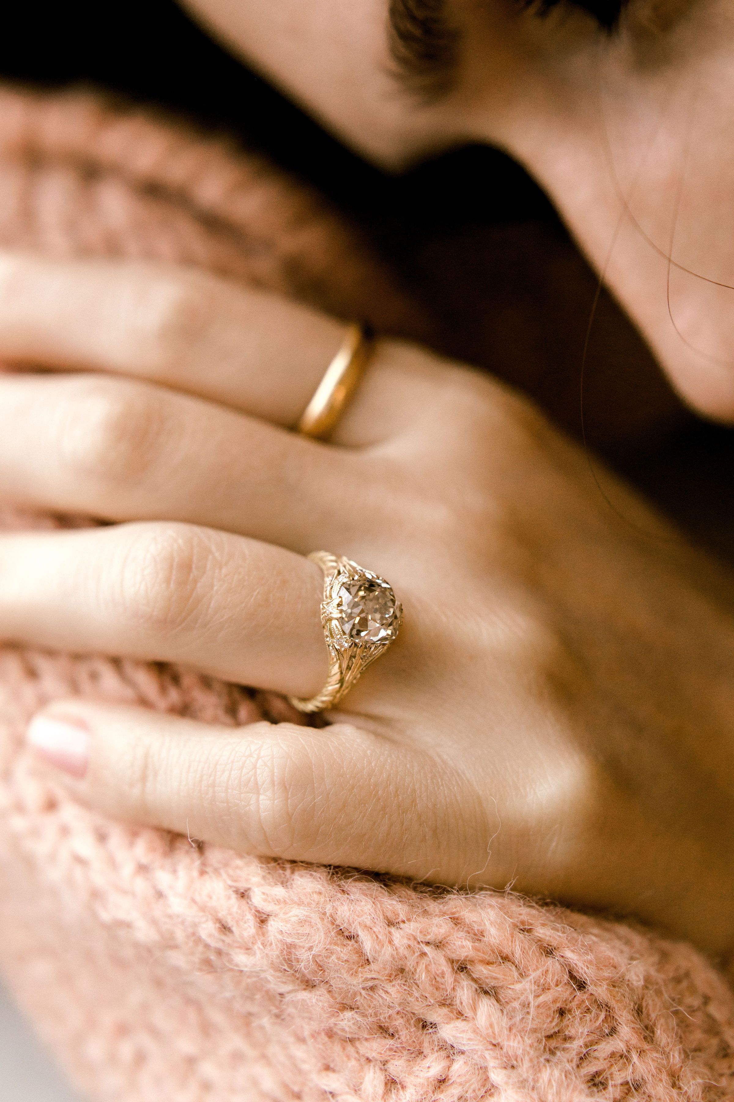 The diamond is a gorgeous and chunky old mine cut in the most lovely champagne hue! Set low in an intricate golden setting with fine details.
