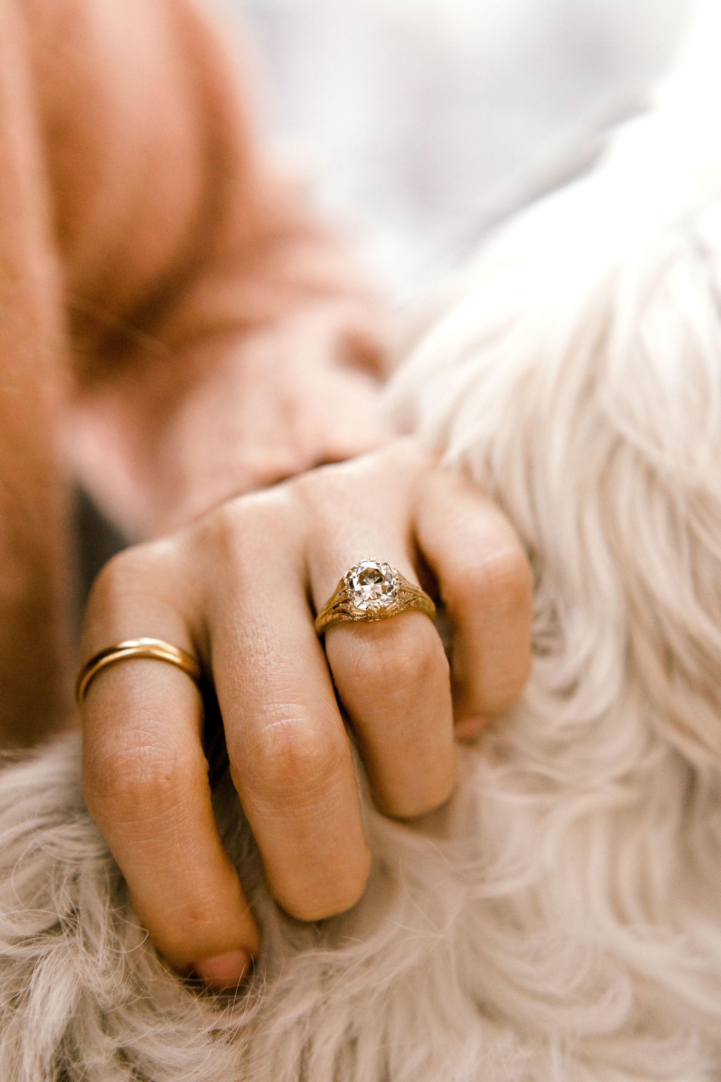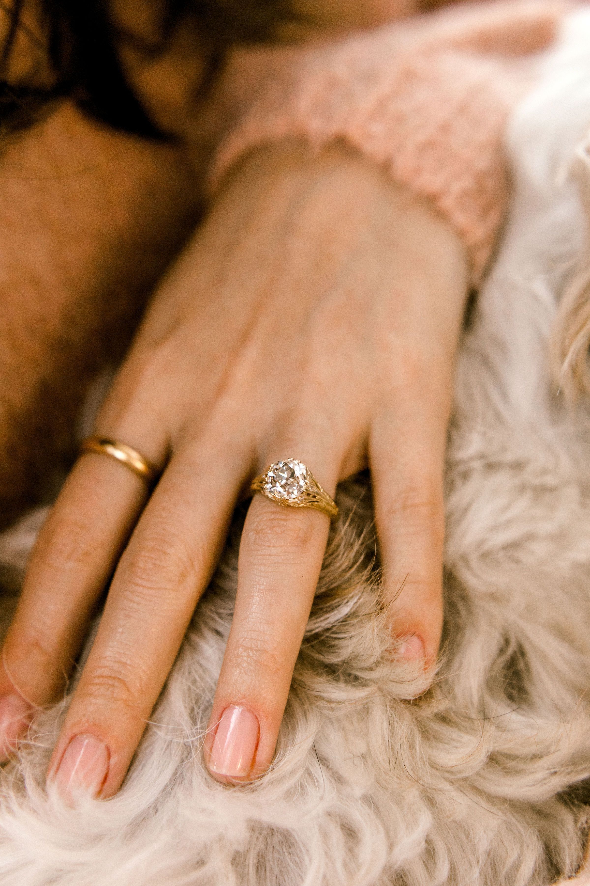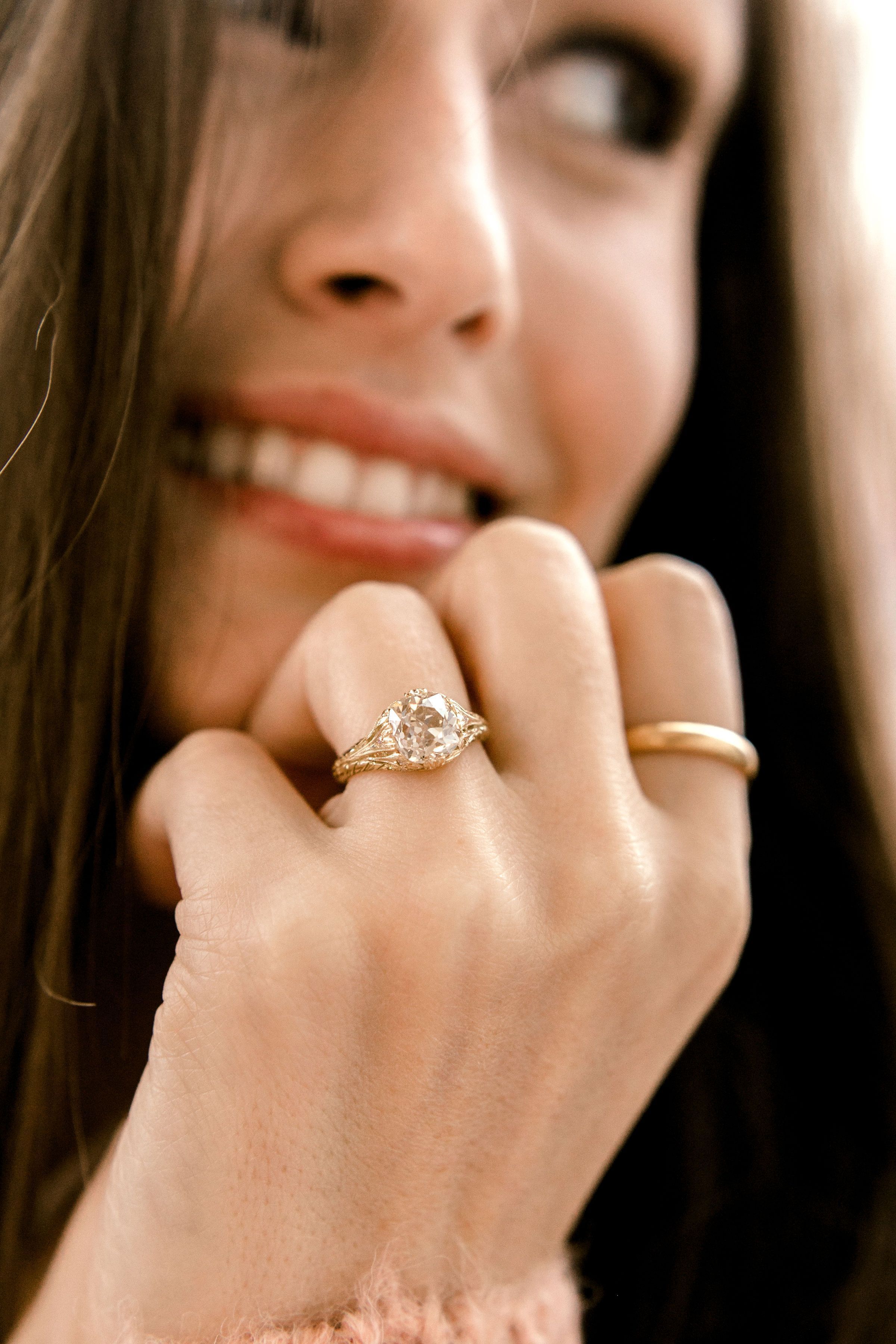 The diamond is a gorgeous and chunky old mine cut in the most lovely champagne hue! Set low in an intricate golden setting with fine details.