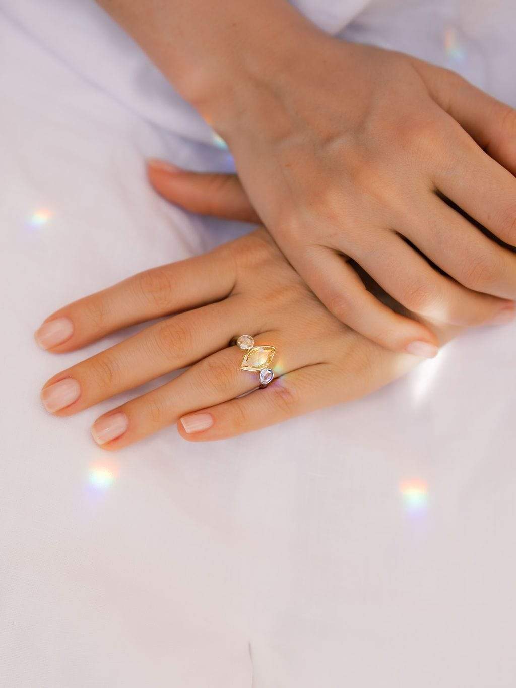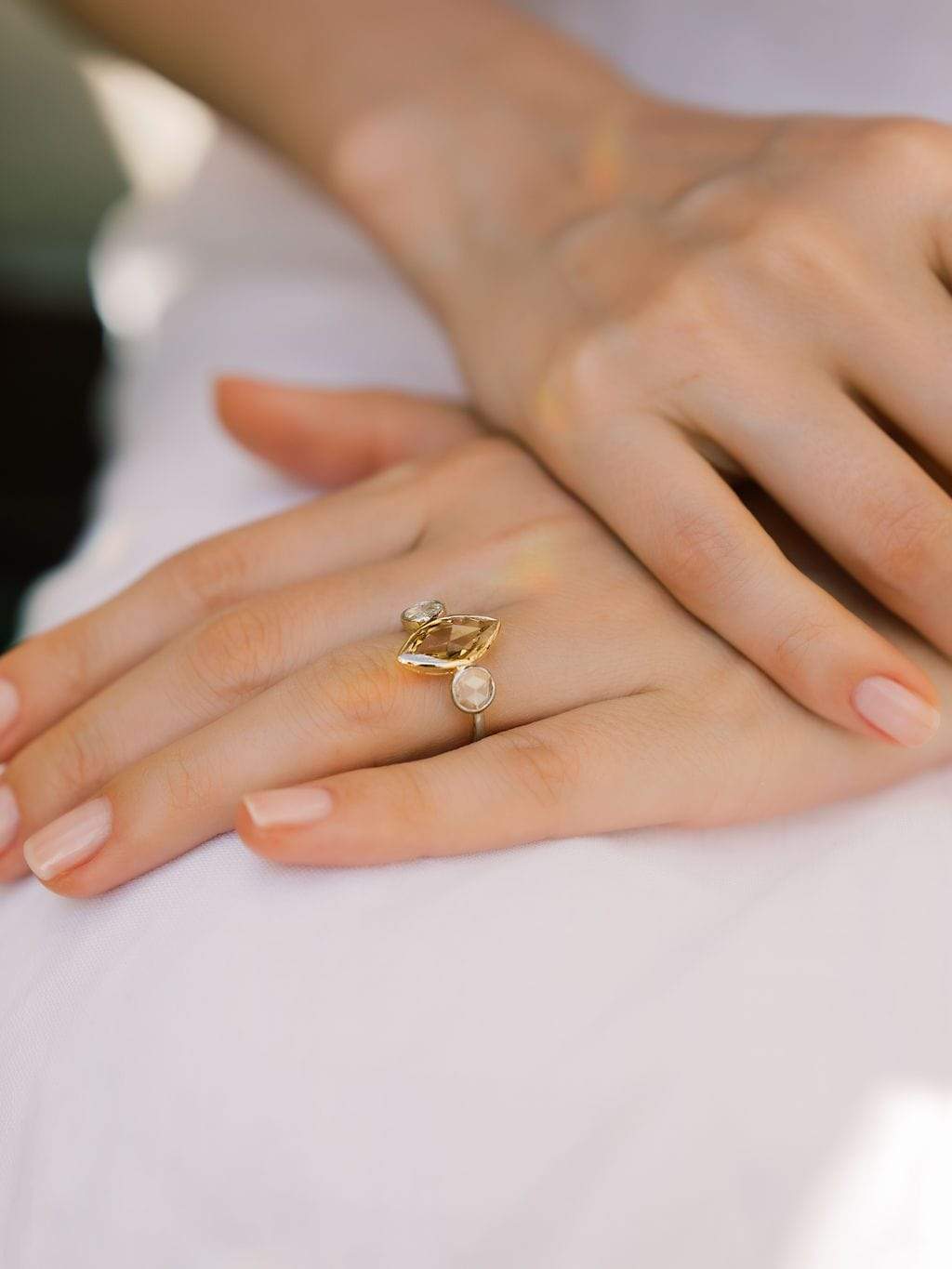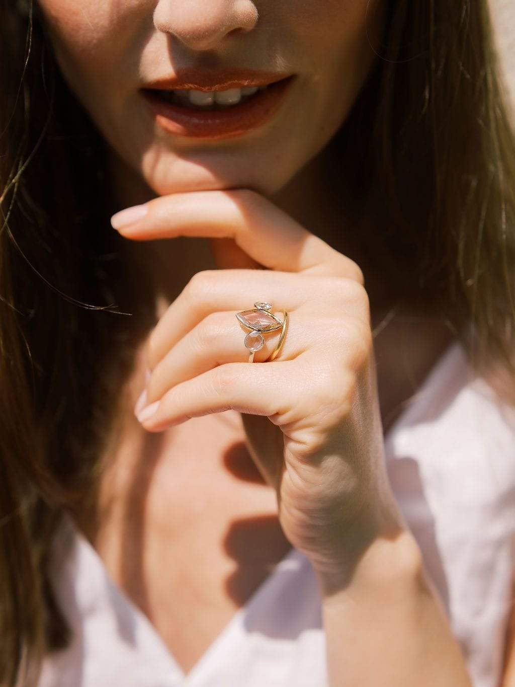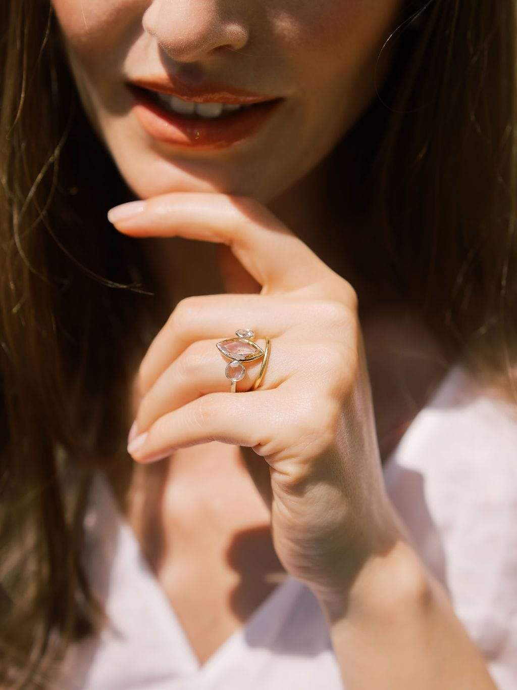 The center stone on this beauty is both a unique color and cut! Part portrait cut, part rose-cut and definitely a Marquise shape, this stone is very one-of-a-kind. This ring is super low profile and takes up some serious real estate.