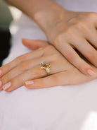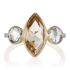 The Julius ring is a remastered vintage piece. The ring centers a GIA certified 1.74 carat Marquise cut diamond of Faint Brown-Yellow color, SI1 clarity. The center stone is bezel-set in 18kt yellow gold. The ring has a bezel-set round rose-cut diamond of approximately I-J color, VS-SI clarity. The band is 22 karat yellow gold and is topped in 18 karat white gold. The ring is currently size 7.5 and can be resized!