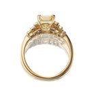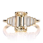 A gorgeous and warm Emerald cut diamond flanked by vertical baguettes gives the Camille ring full finger coverage, and a classic art deco feel.