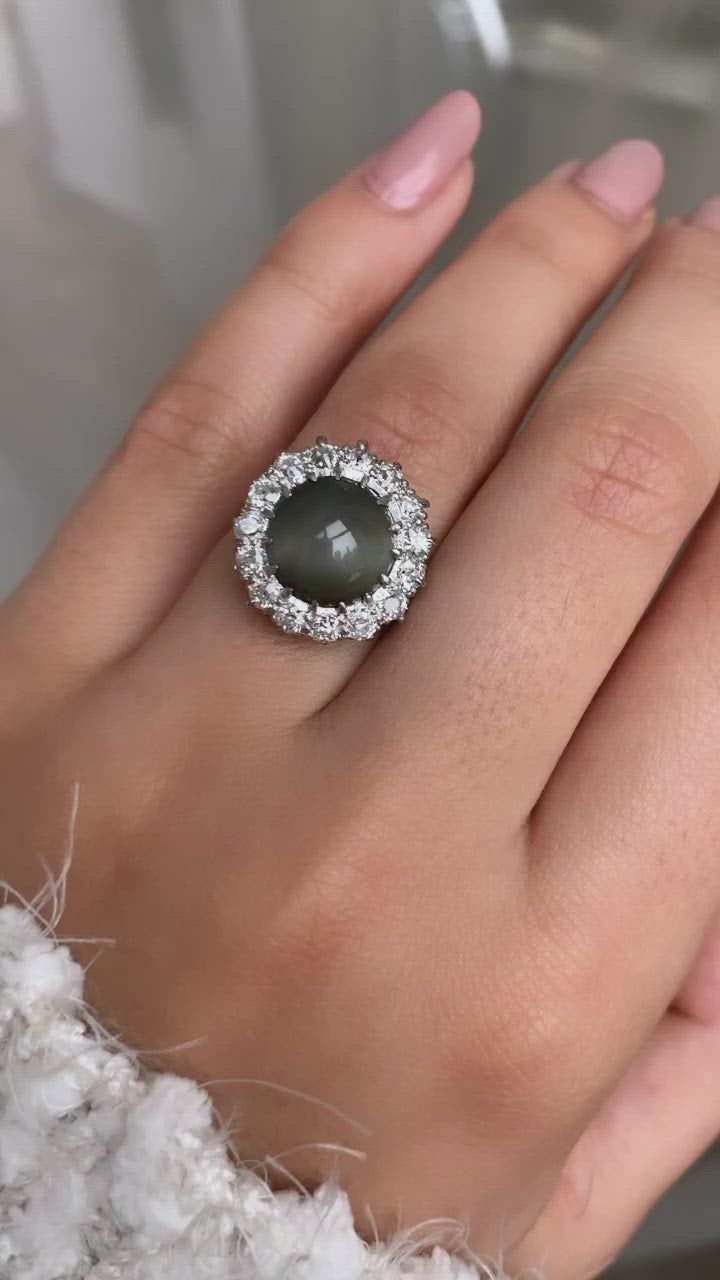 The Sloane ring is a vintage conversion piece with and diamond from the Art Deco era circa 1920. The ring centers a Cabachon Cat's eye Chrysoberyl of approximately 3.5 carats in this lovely deep olive hue. The stone is set in a platinum setting with 15 old European cut diamonds surrounding the stone in a beautiful halo, combining for approximately 0.90 carats. The stones are set in platinum with an 18kt white gold shank. The ring is currently size 6.25 and can be resized!