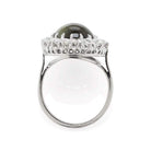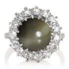 The center stone has a soft deep velvety-olive hue that is just dreamy in contrast with the white diamonds that surround it. It is said that Cat's eye brings happiness, optimism, and good luck.
