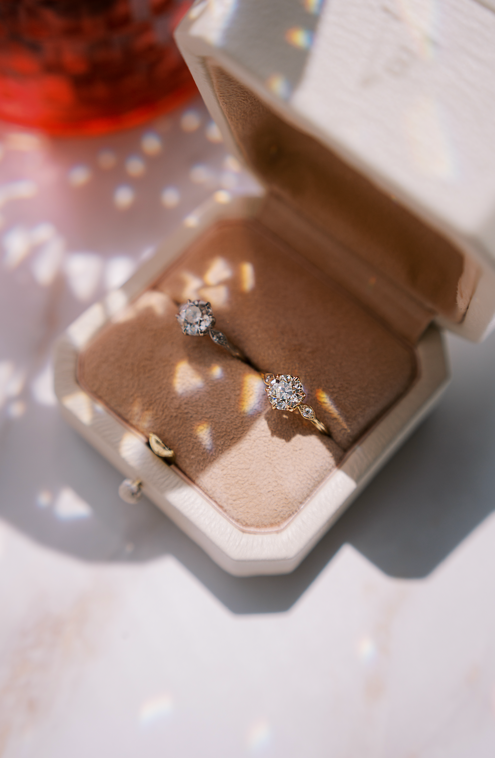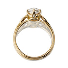 The Alva 1.40 ring is a VB original design made right here in NYC. The ring centers a GIA-certified 1.40-carat old mine cut diamond of I color, SI2 clarity. The stone is set in a 6-prong 18kt yellow gold setting with leaf-like shoulders set with an old cut diamond in the center. The ring is currently size 6 and can be resized!