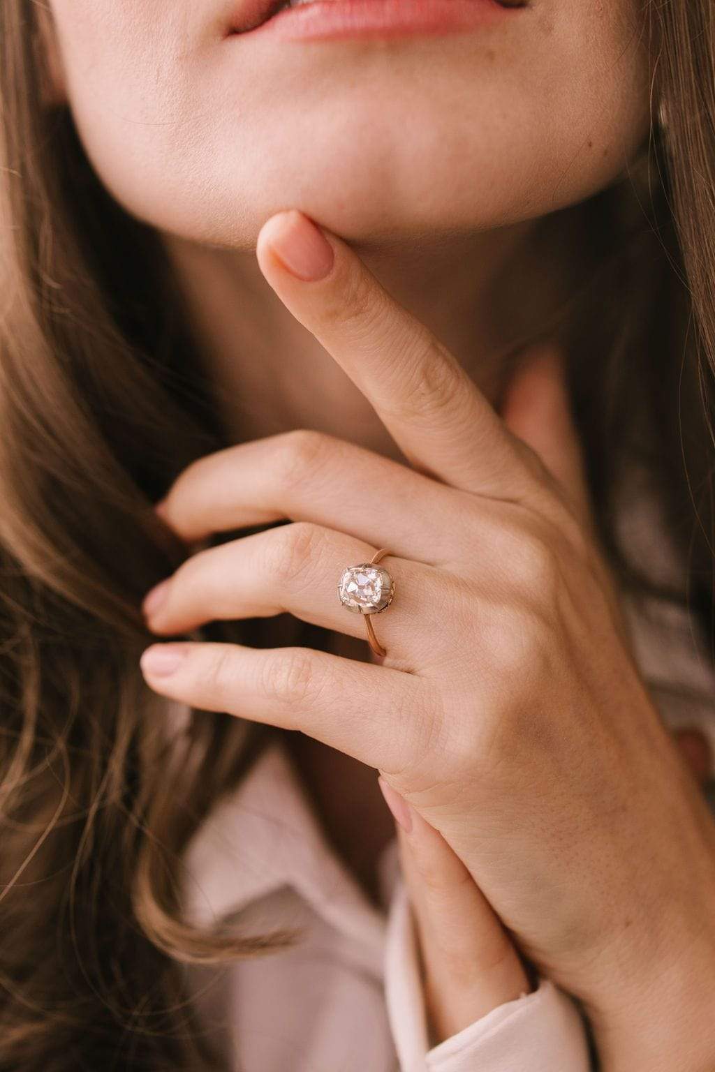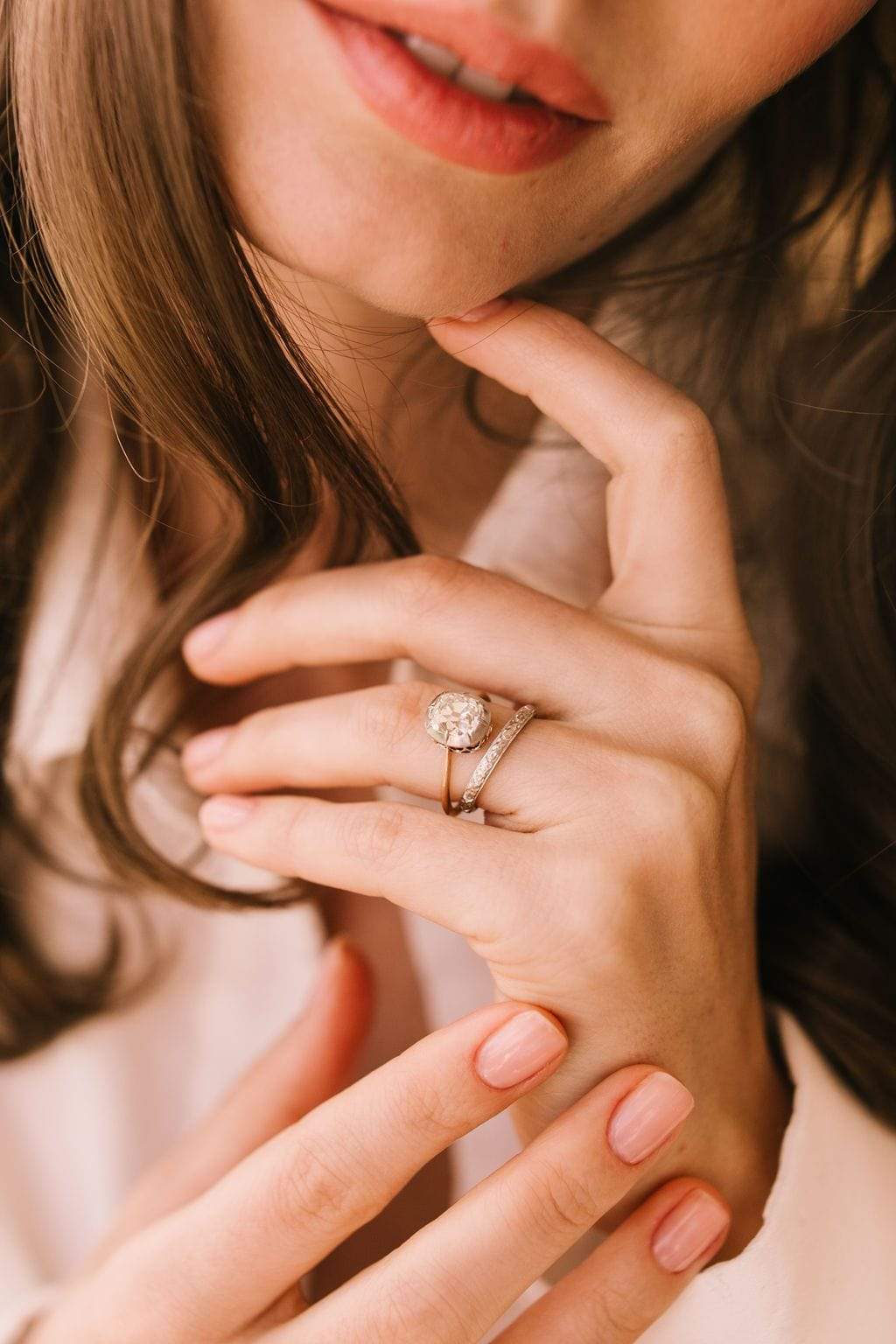 The Ophelia ring is a conversion piece converted from a Victorian Necklace circa 1880! This Collet Set Diamond Engagement Ring centers a GIA Certified 2.08 carat old mine cut diamond of L color, VS1 clarity. The diamond is set in a platinum-topped 18kt rose gold collet setting. The gallery has beautiful swooping details with a delicate tapered shank. The ring is currently size 6.75 and can be resized!
