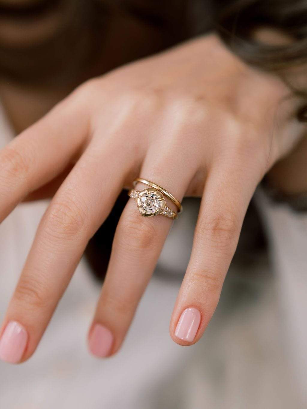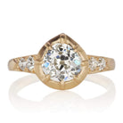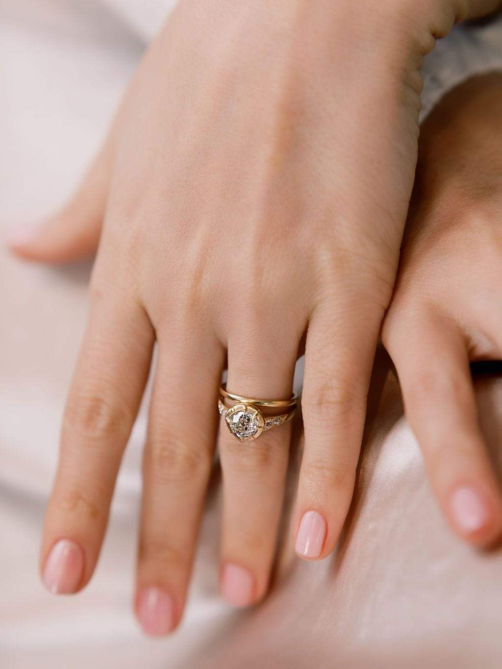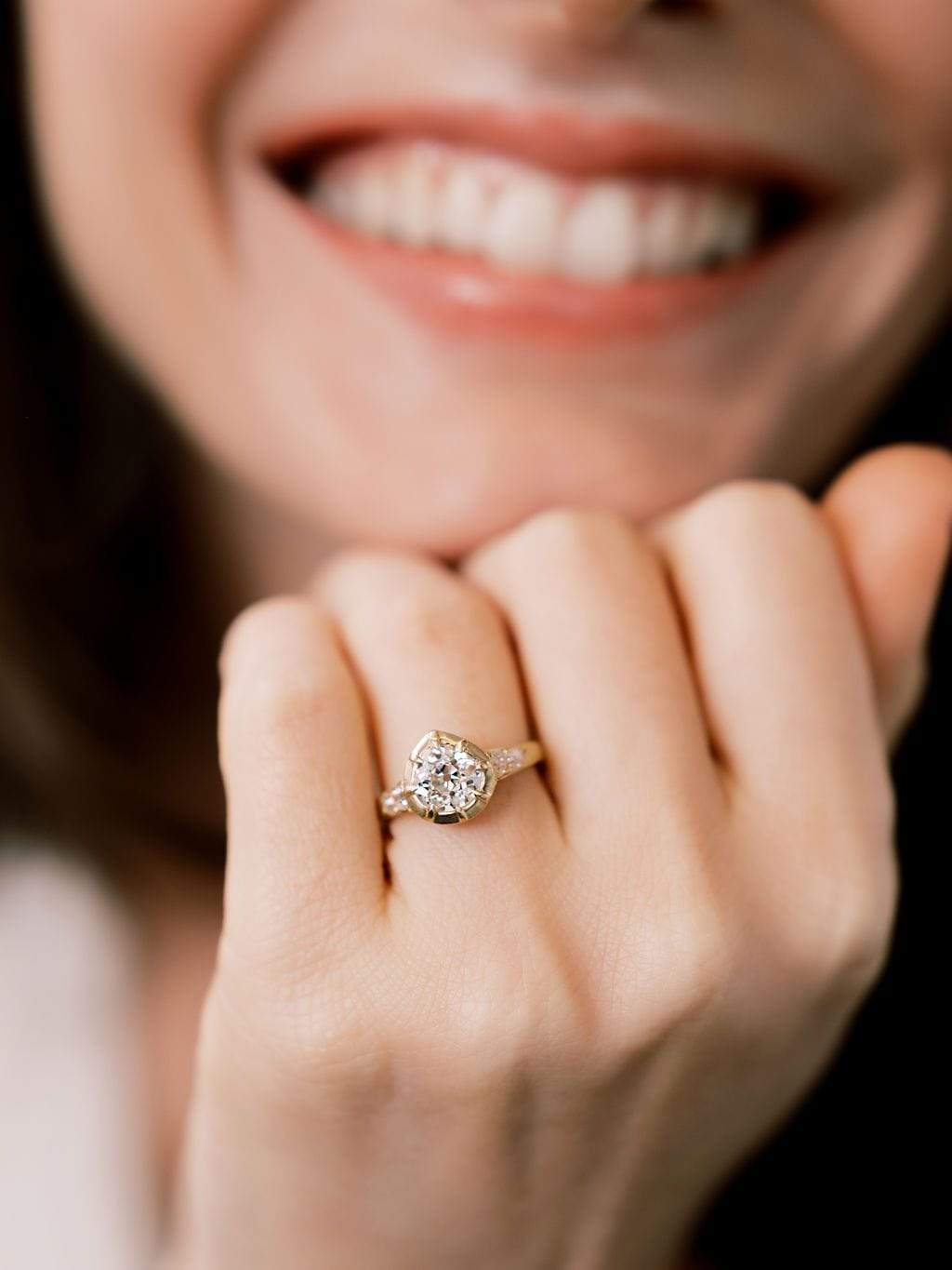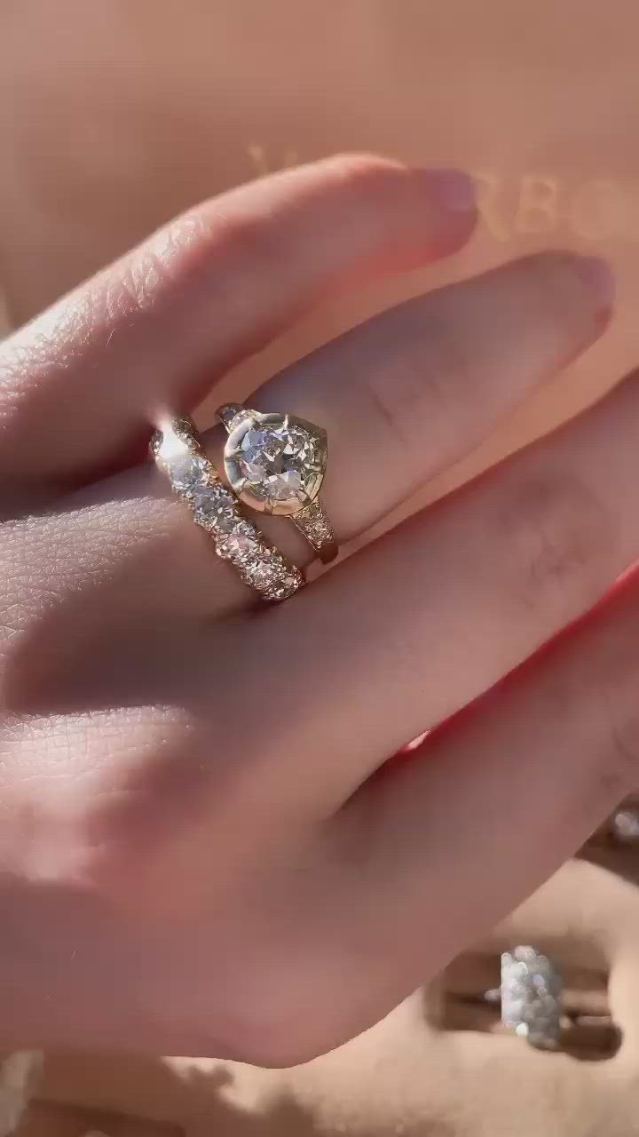 We are big fans of the collet-style setting which is a very antique style of setting! This diamond is a gorgeous, super chunky antique stone that just shines so brightly. The ring is low-profile.