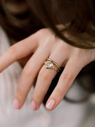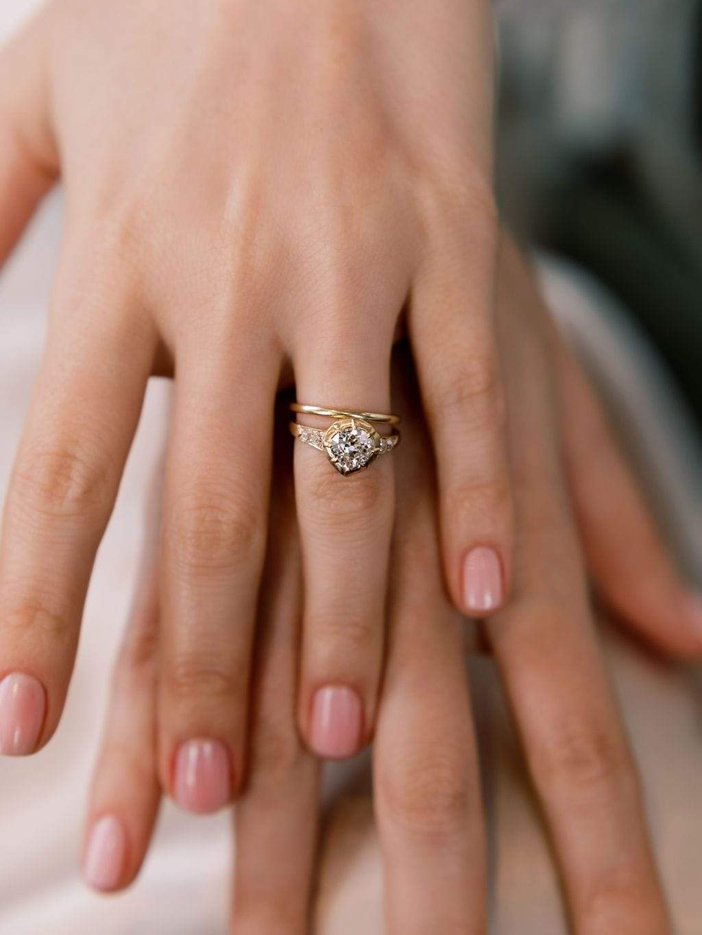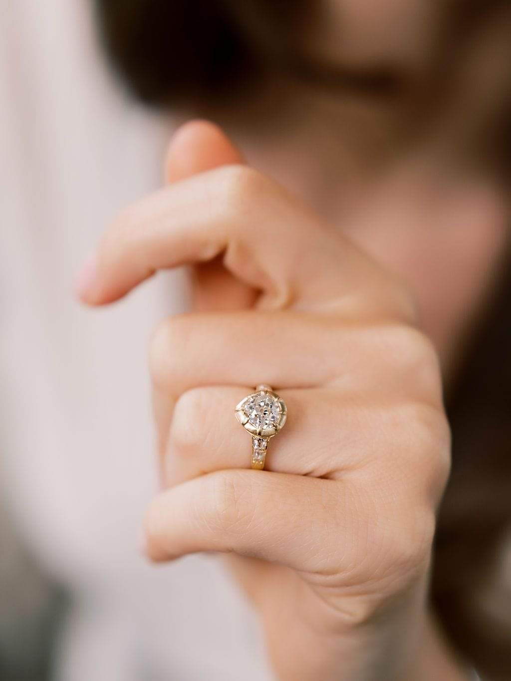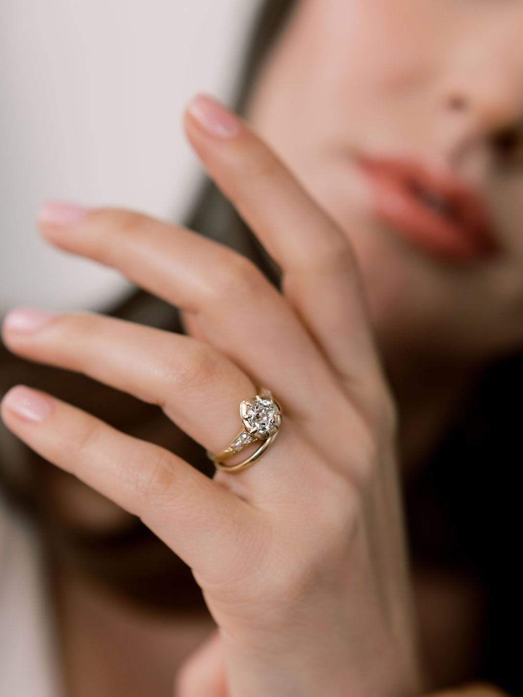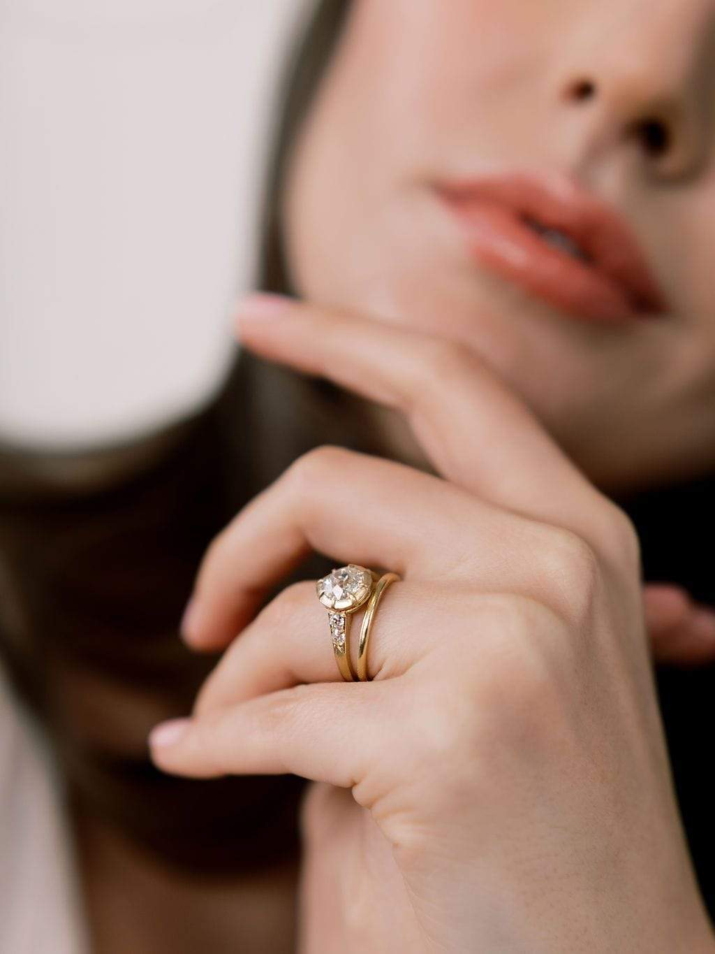 We are big fans of the collet-style setting which is a very antique style of setting! This diamond is a gorgeous, super chunky antique stone that just shines so brightly. The ring is low-profile.