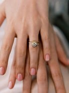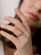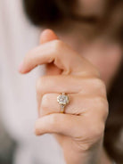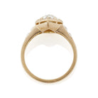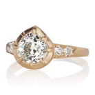 The Andria 1.31 ring is an original VB design made here in NYC using authentic antique diamonds! The ring centers a GIA certified 1.31 carat old mine cut diamond of J color, SI1 clarity. The diamond is collet set in an 18kt yellow gold ring with two small old cut diamonds set into each shoulder. The ring is size 6 and can be resized!