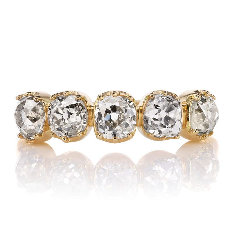 The Andria Band 1.91 is a VB original design made right here in NYC. The ring features 5 old mine cut diamonds of a light Champagne color, VS-SI clarity. The diamonds combine for 1.91 carats and are collet-set in an 18 karat yellow gold setting. The ring is currently size 6.5 and can be resized!