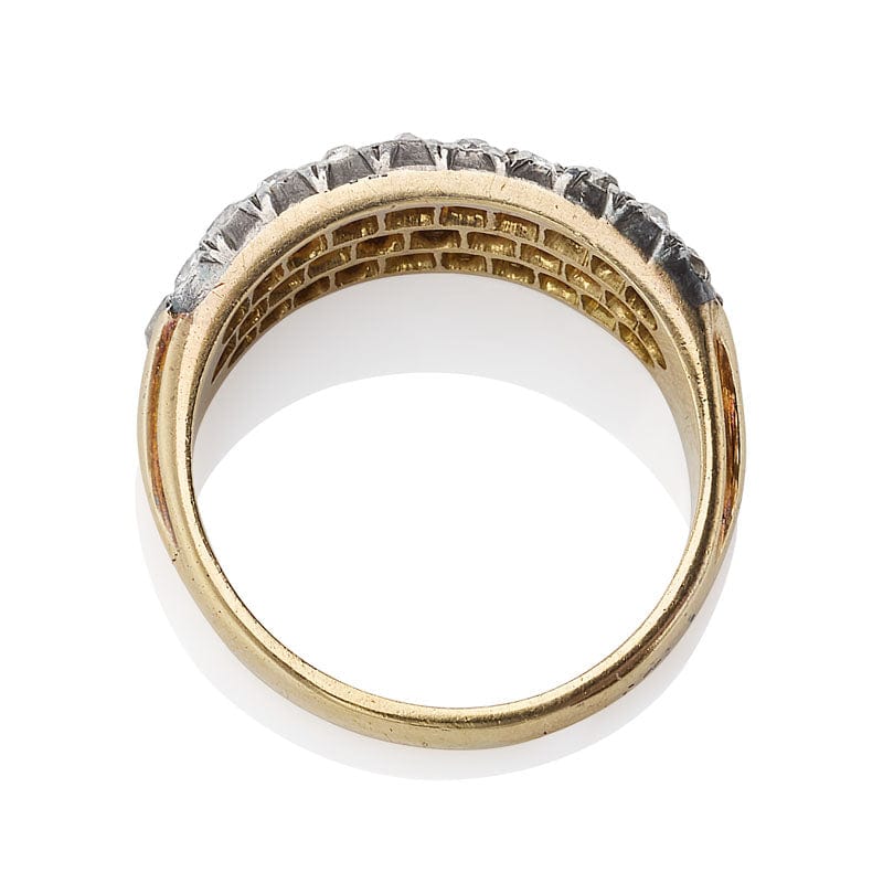 The Desiree ring is an authentic vintage diamond ring from the Victorian Era circa the mid-1800s. The ring features three rows of 31 small old cut diamonds in a half hoop design. The stones are set in a silver and 18kt yellow gold setting. The ring is currently size 7.75 and can be resized to some sizes!