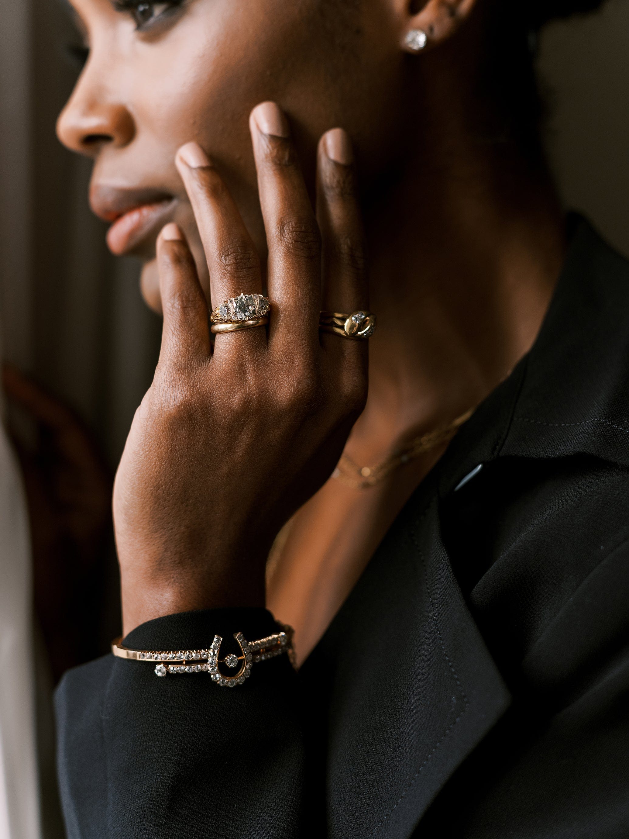 We drew strong inspiration from Victorian Era rings with scrolling, open-air designs in the gallery and beautiful, warm, chunky old mine cuts at the forefront.
