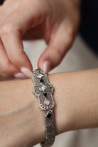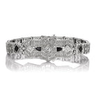 The Winbury bracelet combines the detailed filigree, bold geometric shapes, and contrasting colors we admire about Art Deco jewelry design. This statement piece stuns with intricate metalwork showcasing impeccable craftsmanship and attention to detail--no part of this bracelet is left unadorned! Delicate and striking at the same time, Winbury is a true Jazz Age standout that is just as unique today as she was 100 years ago.