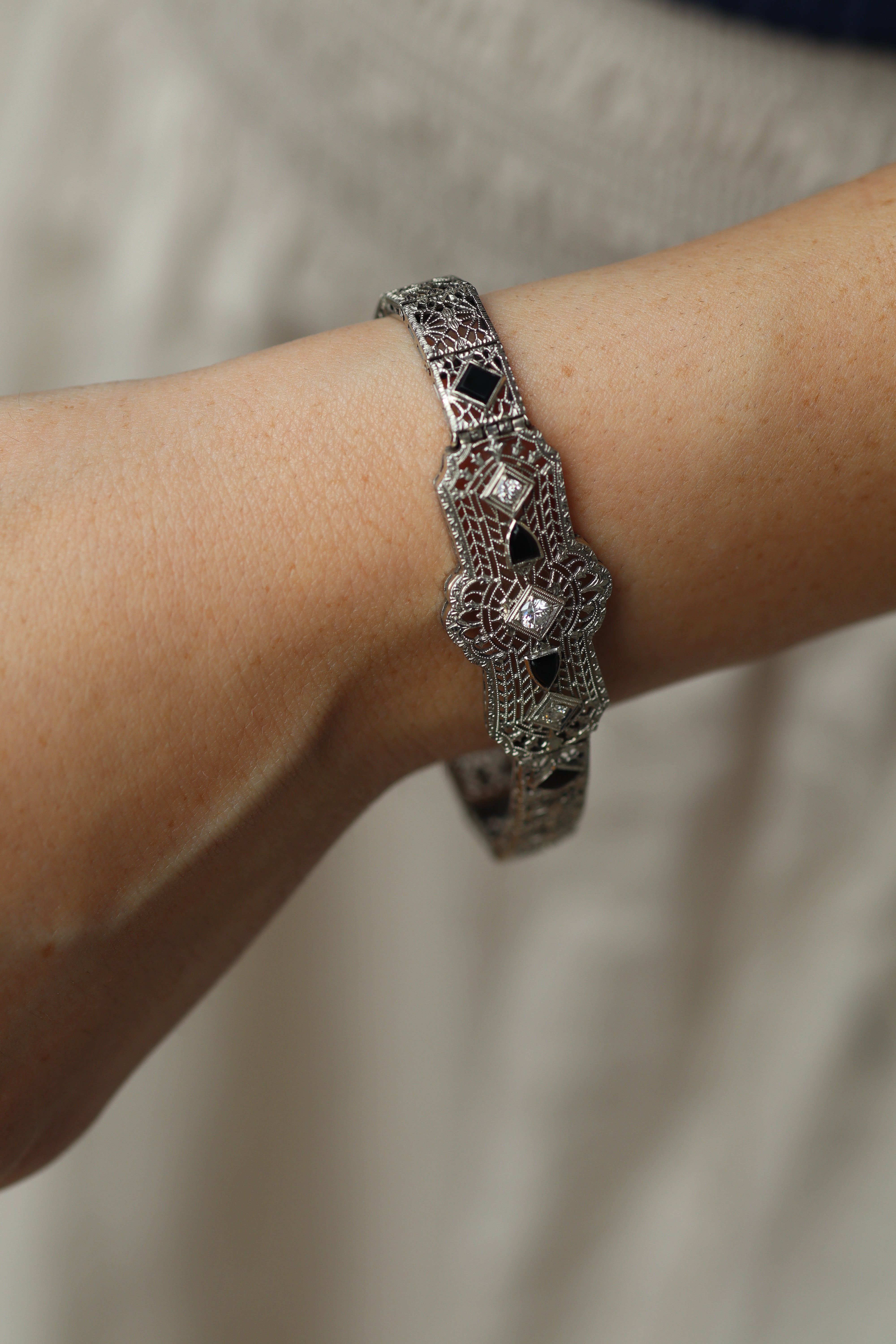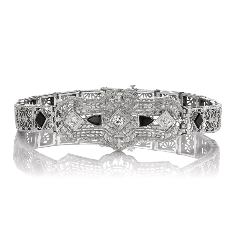 The Winbury bracelet is an authentic Art Deco era piece, circa 1920. The bracelet features a uniquely shaped central pendant with intricately detailed filigree throughout. On the central pendant, three single-cut diamonds of H-I color, VS-SI clarity, combine for an approximate total of 0.50 carats. The diamonds are bezel-set with fine milgrain detail surrounding the stones. Two bullet-shaped onyx stones are set on each side of the center diamond. Each link of the bracelet is intricately detailed with filigree. Two additional onyx stones are set in the center of the link on each side of the central pendant. The entire setting of the bracelet is 14kt white gold. The bracelet measures 7.2 inches.