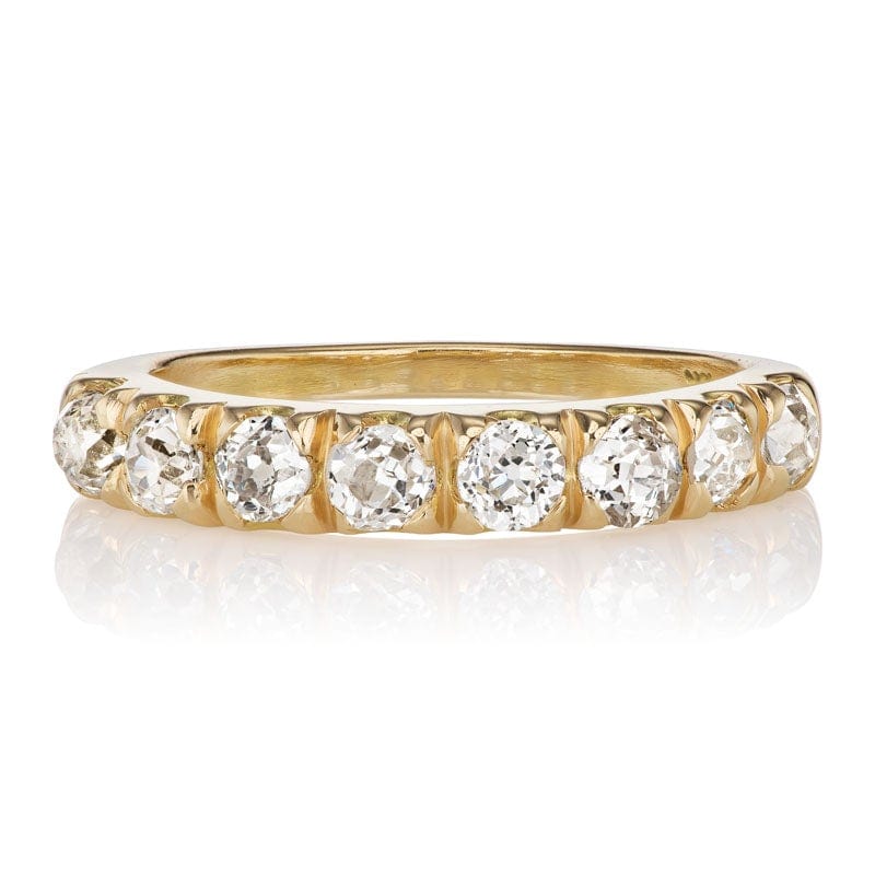 The Devon 0.95 band is a VB original design made right here in NYC. The ring features 8 old mine cut diamonds of approximately J-K color, VS-SI clarity that combine for 0.95 carats. The stones are set in an 18 karat yellow gold setting. The ring is currently size 5.5 and can be resized!