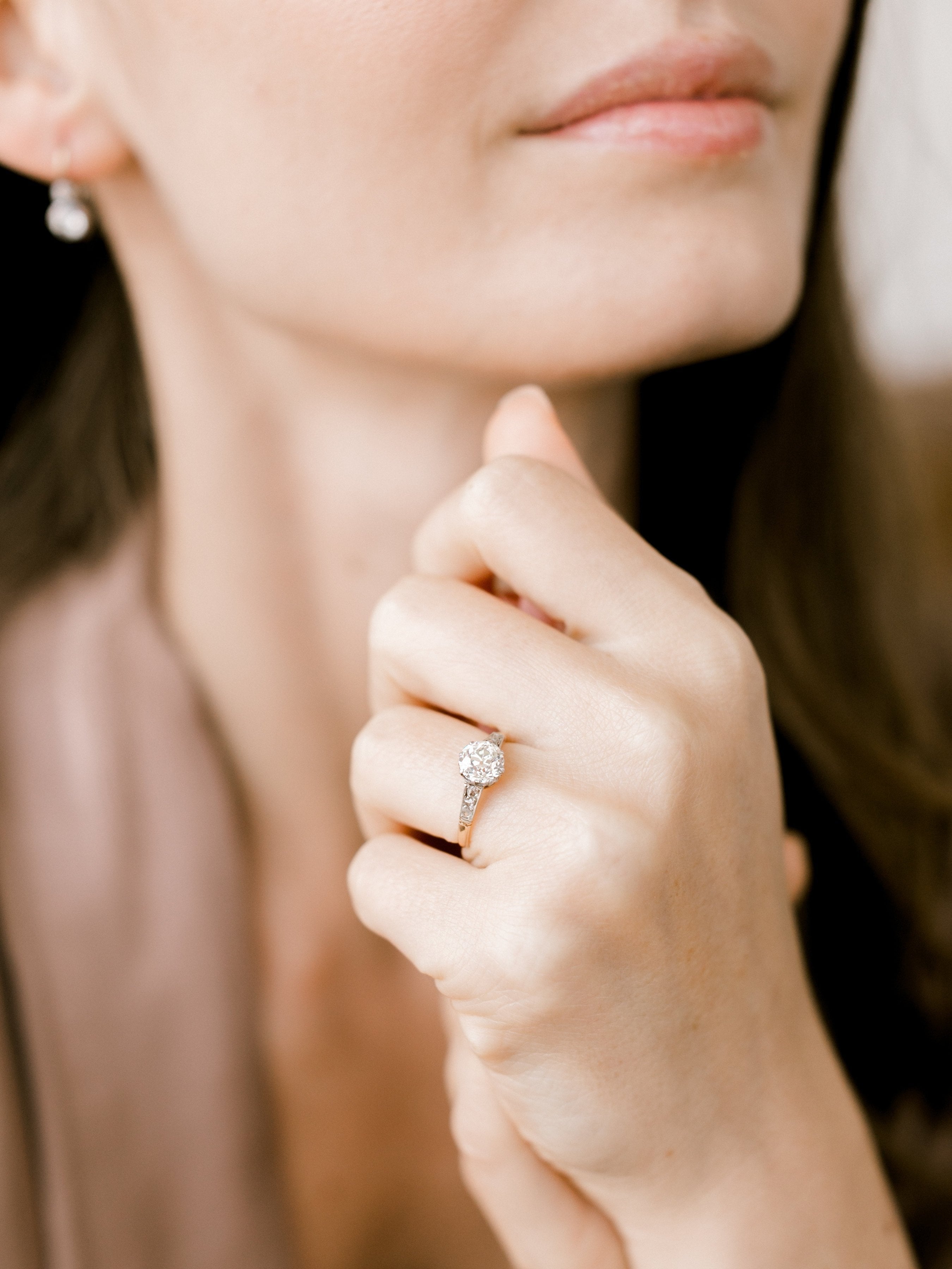 The Megara ring is a diamond basket engagement ring from the Edwardian Era, circa 1910! The ring centers a GIA Certified 1.24ct old European cut diamond of L color, VS2 clarity. The diamond is set in an 8-prong platinum basket with three rose cut diamond to each side that are set in platinum-topped yellow gold. The ring is size 5.5 and can be resized!