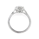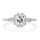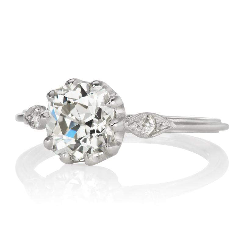 The Alva 1.26 ring is a vintage-inspired VB-made diamond engagement ring. The ring centers a GIA certified 1.26-carat old mine cut diamond of J color, I1 clarity. The stone is set in a platinum setting with an old mine cut diamond set into each shoulder, both combining for approximately 0.08 carats. The ring is currently size 4.5 and can be resized!