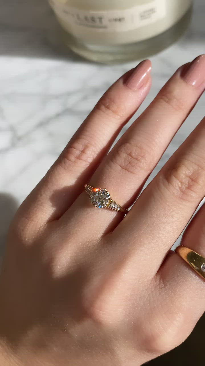 The Cynthia 1.17 ring is a VB original design made here in NYC centering an authentic antique diamond. The ring centers a GIA certified 1.17-carat old European cut diamond of M color, VS1 clarity. The stone is set in a 6 prong 18-karat yellow gold setting with a tapered baguette diamond to each side. The ring is currently size 6.25 and can be resized!