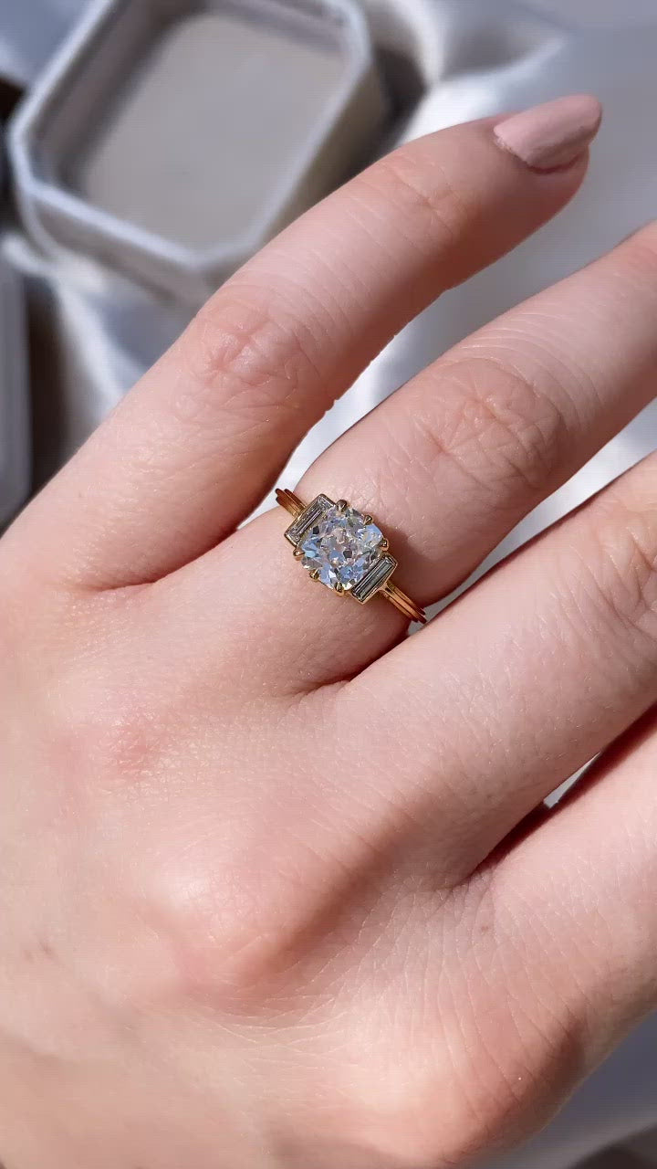 The Petra 1.47 ring is a VB original design made right here in NYC. The ring centers a GIA certified 1.47-carat old mine cut diamond of I color, SI1 clarity. The stone is set in a 6-prong 18 karat yellow gold setting. A diamond baguette is vertically-set to either side of the center stone. The side stones are of coordinating color and VS clarity and combine for 0.08 carats. The ring is currently size 6 and can be resized!