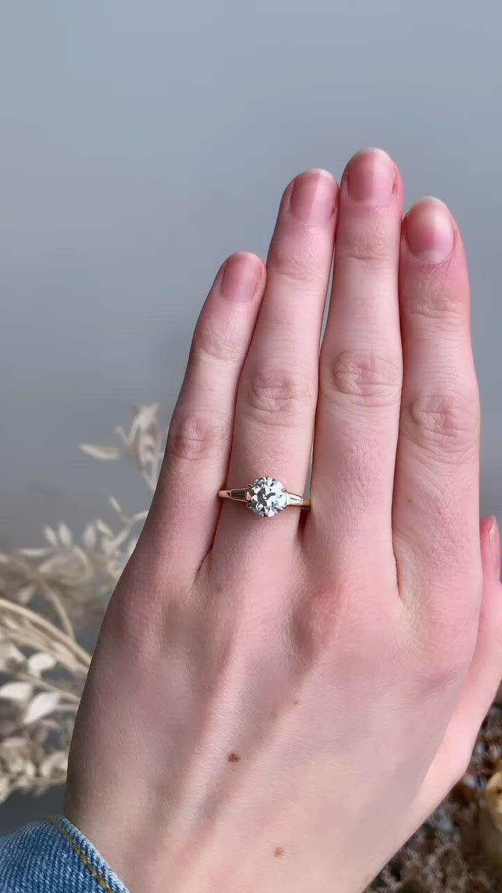 The Cynthia 1.58 ring is a VB original design made right here in NYC. The ring centers a GIA-certified 1.58-carat old European cut diamond of J color, VS1 clarity. The stone is set in a 6-prong 18 karat yellow gold setting with a tapered baguette to each side. The ring is currently size 6.25 and can be resized!