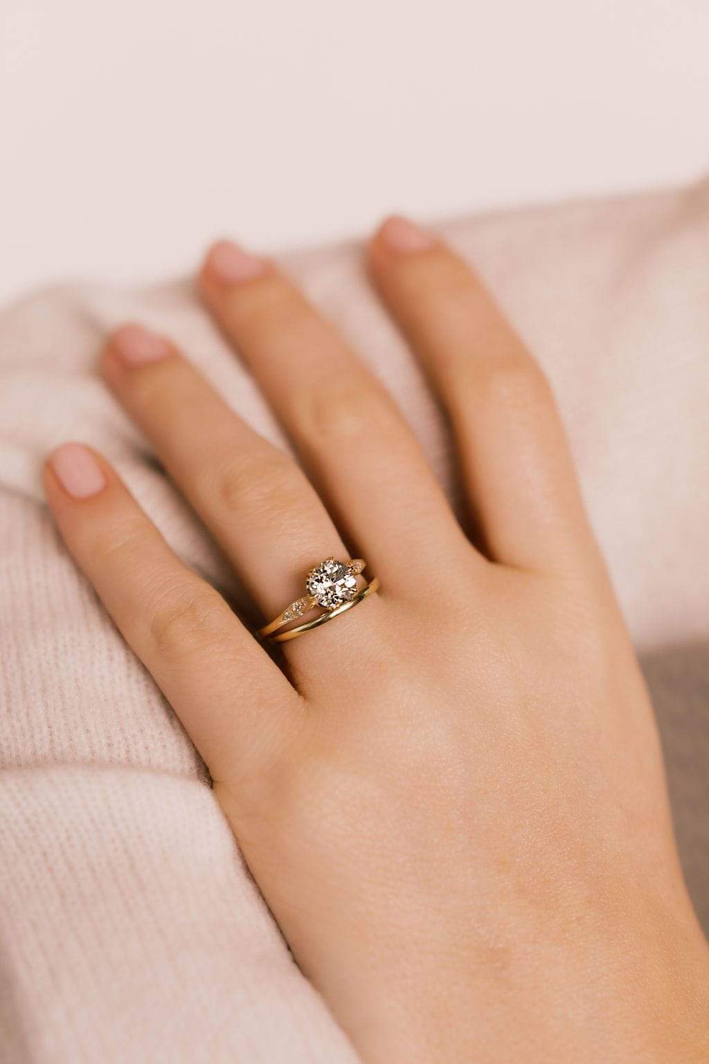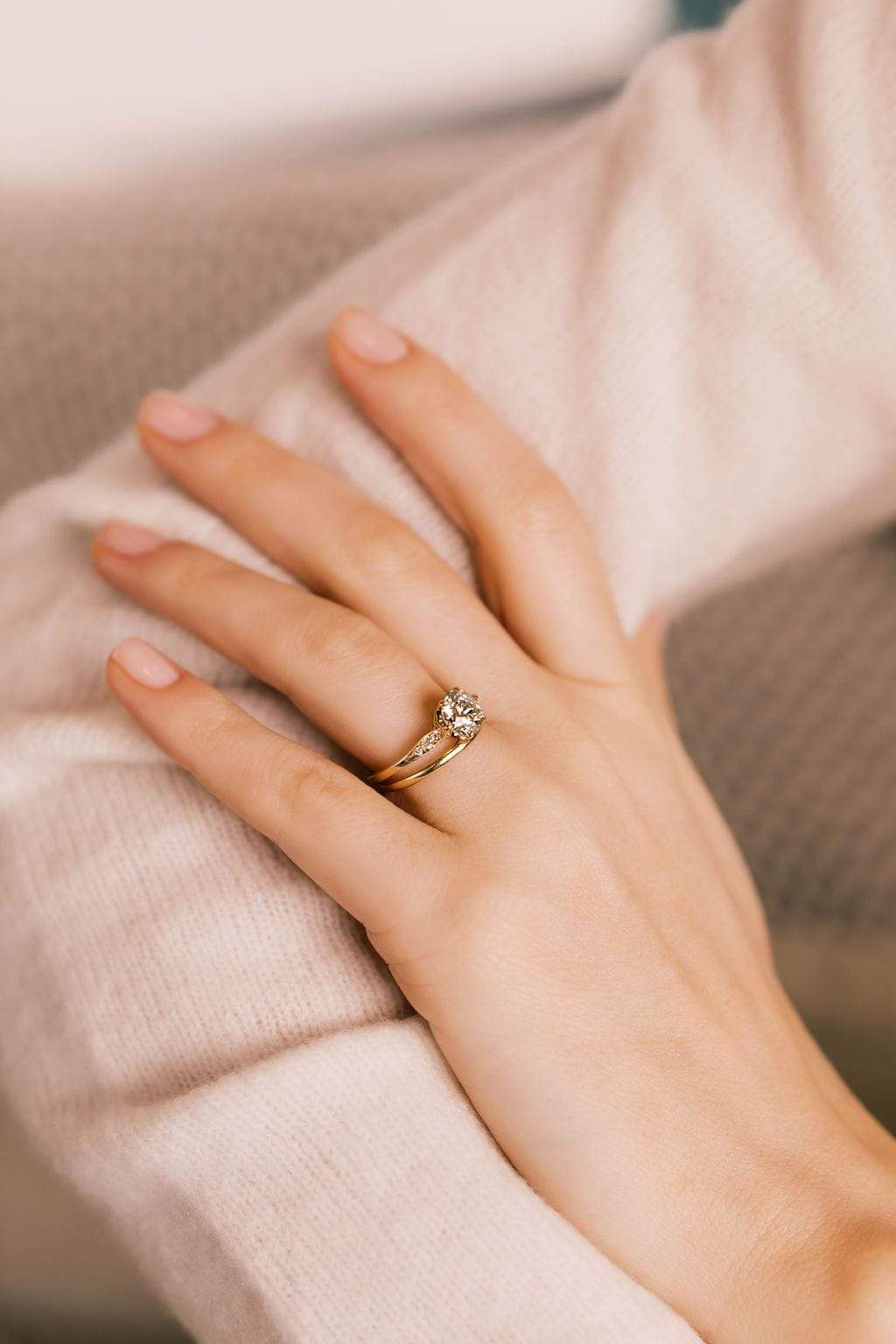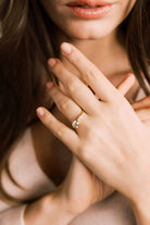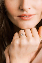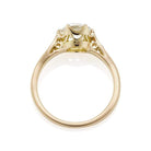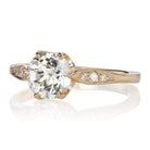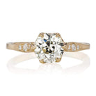 The Peach 1.45 ring is a vintage-inspired VB-made diamond engagement ring. The ring centers a GIA certified 1.45-carat old European cut diamond of M color, VS2 clarity. The stone is set in a 6 prong 18-karat yellow gold setting. Two old European cut diamonds are bead-set into each of the shoulders of the ring. The ring is currently size 6 and can be resized!