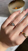 The Petra 1.47 ring is a VB original made here in NYC using an authetnically antique diamond. The ring centers a GIA certified 1.47-carat old mine cut diamond of J color, VS2 clarity. The stone is set in an 18-karat yellow gold setting with a bezel-set sapphire to each side. The ring is currently size 6 and can be resized!
