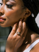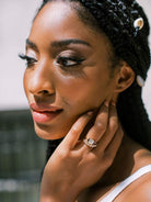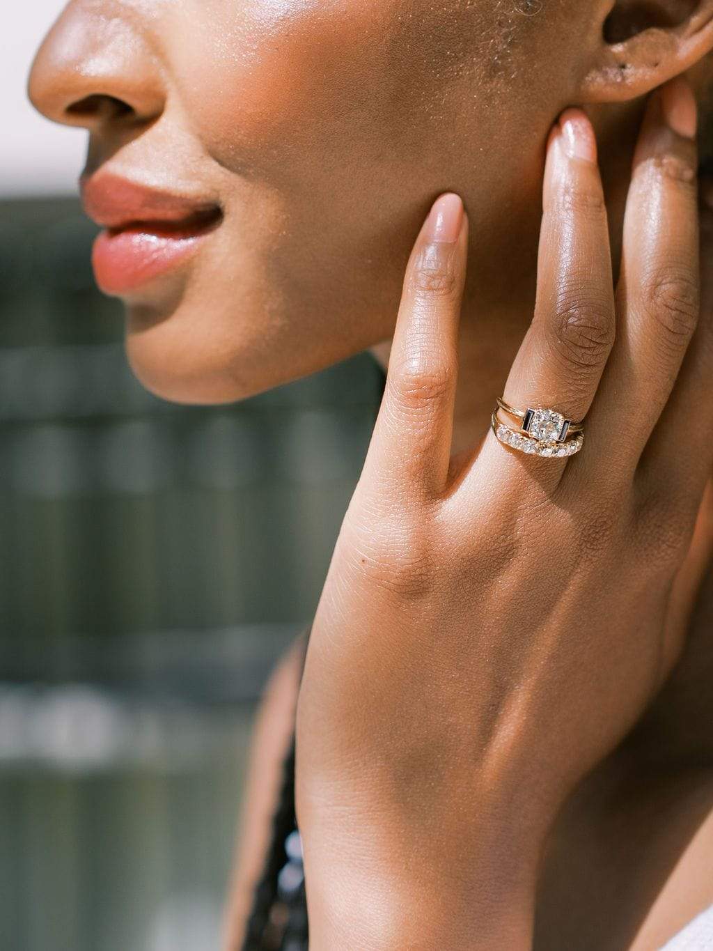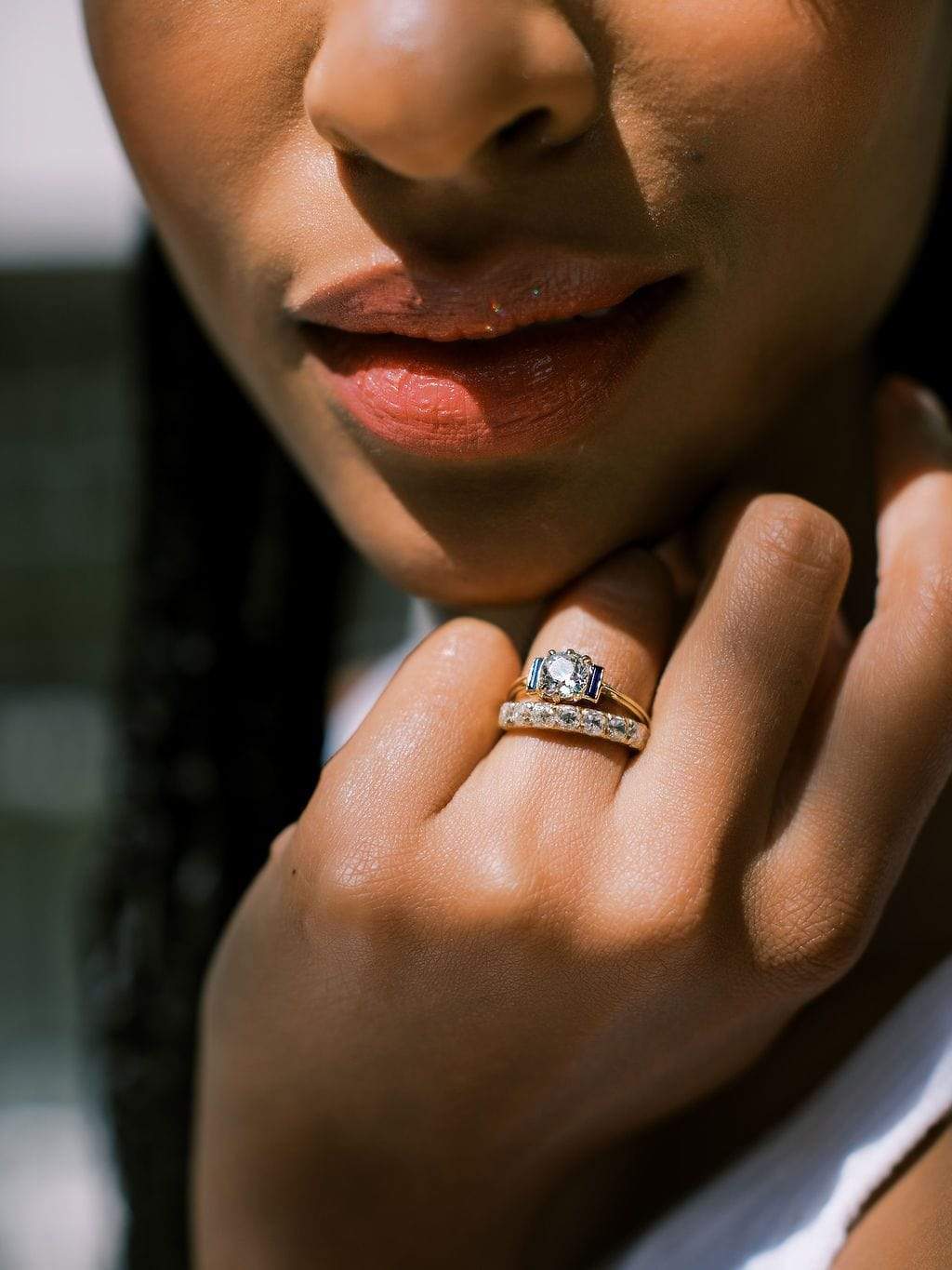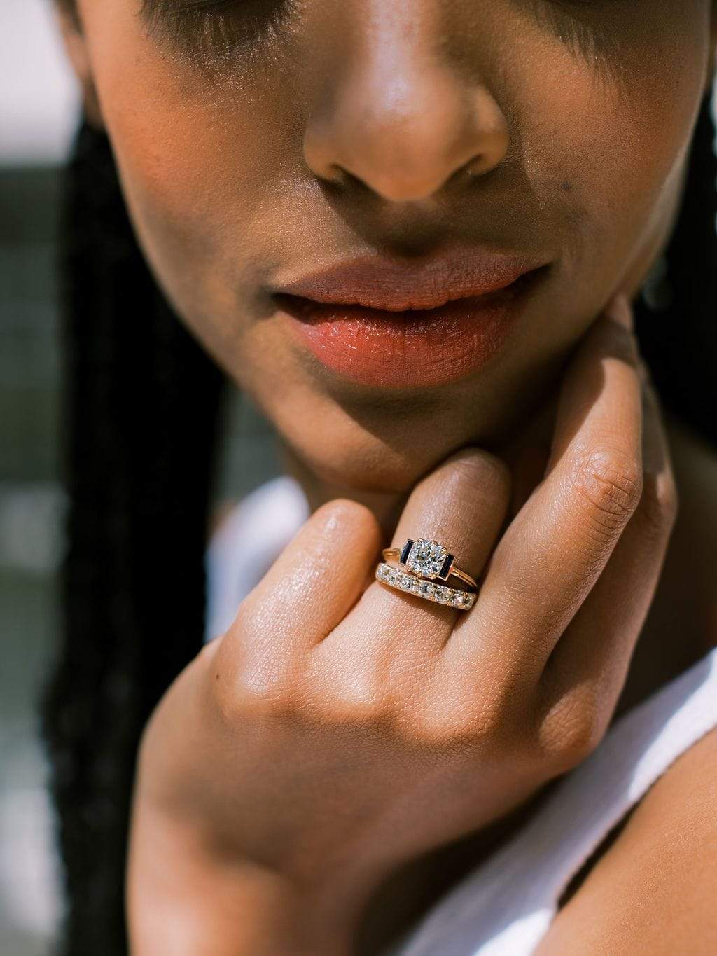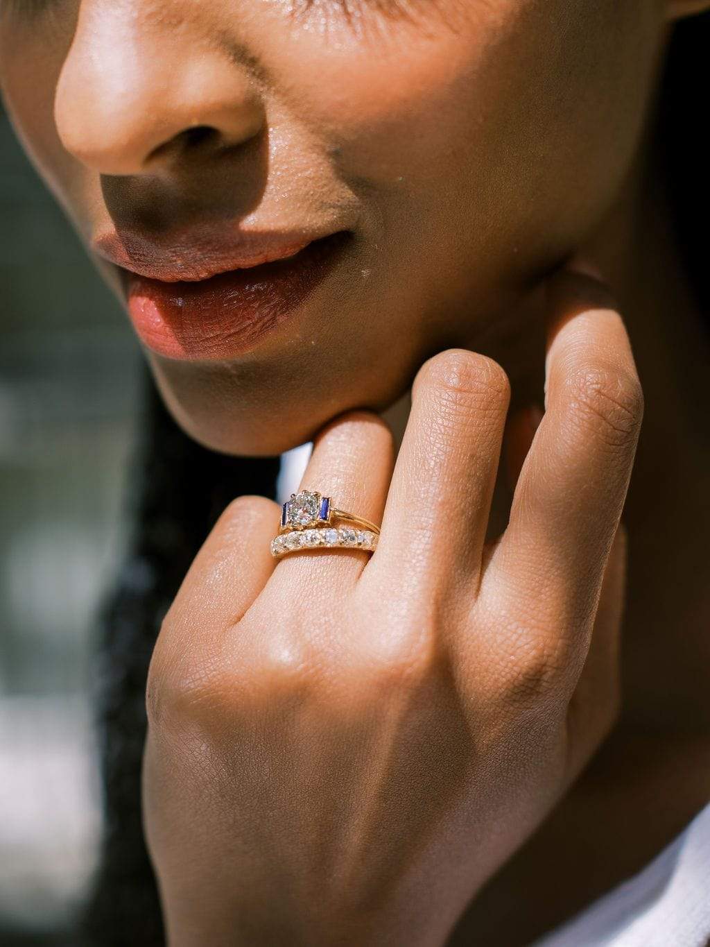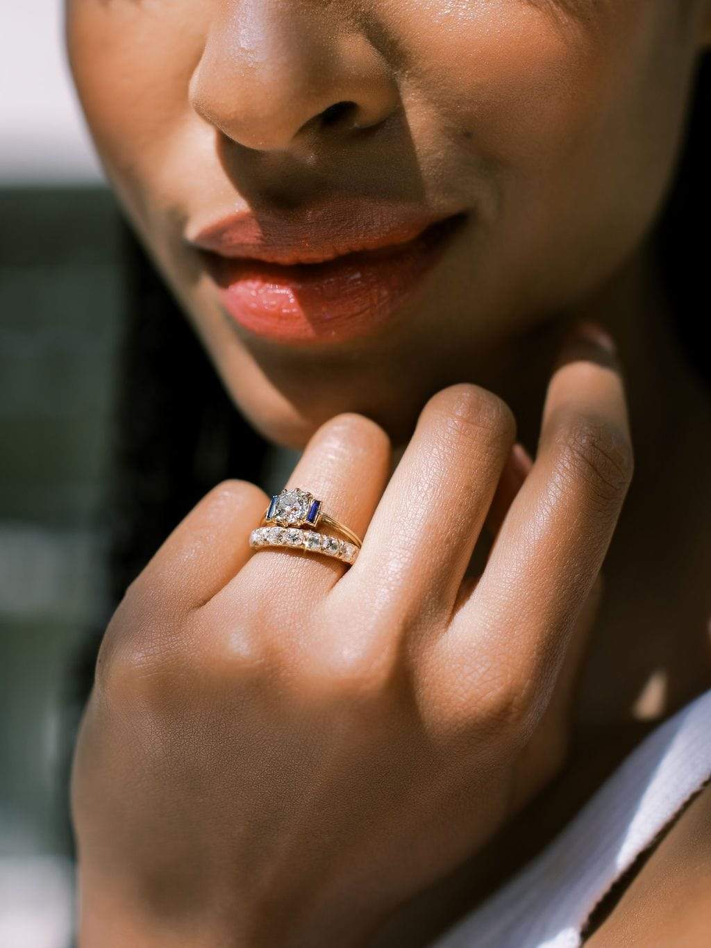An Art Deco-inspired piece that has all the drama of that era in a piece that feels on point for today's trends. A gorgeous antique diamond takes the stage with the perfect vibrant blue accents and a lowww profile.