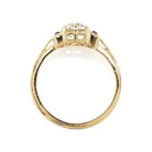 The Petra 1.19 ring is a Vintage-Inspired ring made here in NYC. The ring centers a GIA certified 1.19-carat old mine cut diamond of L color, VVS2 clarity. The stone is set in an 18-karat yellow gold setting. To each side of the center stone is a vertically-set bezel-set sapphire baguette. The ring is currently size 6 and can be resized.