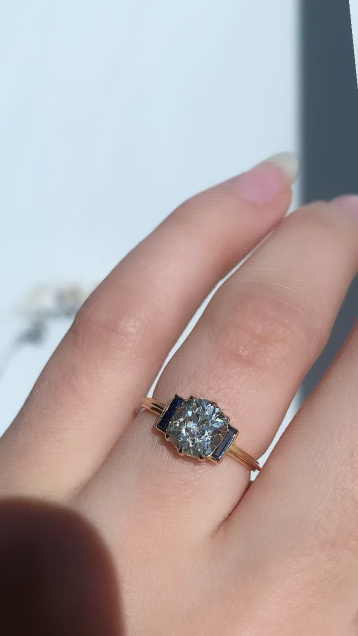 The Petra 1.66 ring is a VB original made right here in NYC centering an authentic antique diamond. The ring centers a GIA certified 1.66-carat old mine cut diamond of O-P color, VS2 clarity. The stone is set in an 18 karat yellow gold setting with a natural sapphire baguette bezel-set to either side of the center stone. The ring is currently size 6 and can be resized!