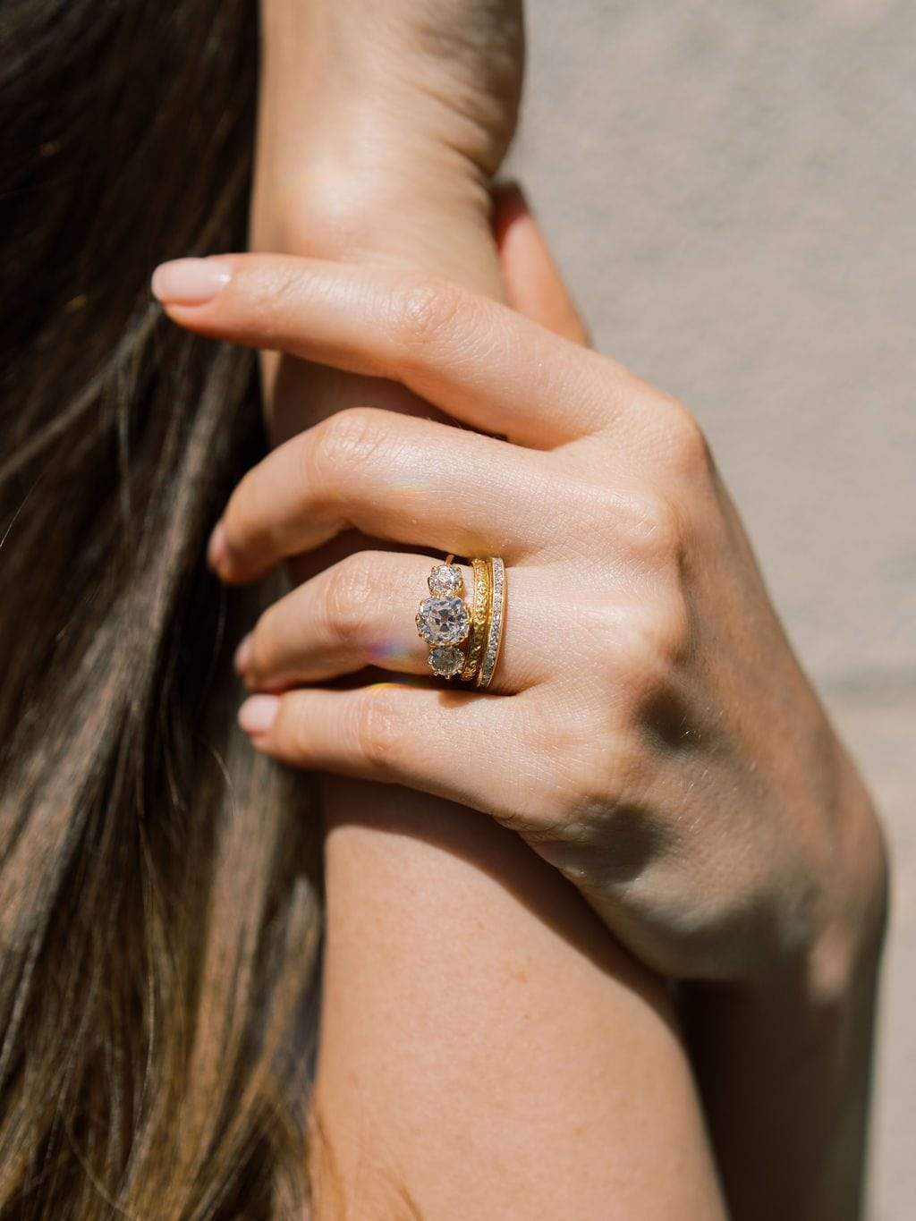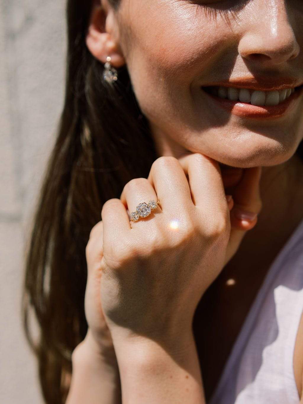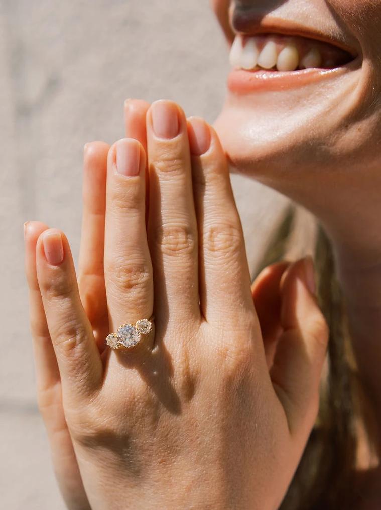 These chunky old mine cuts are a match made in heaven and fulfilling all your three stone dreams. They each have such a deep sparkle and aren't afraid to put you into a trance. Finger-spanning and finger-flattering with a vibrant white color and super easy to pair with bands!