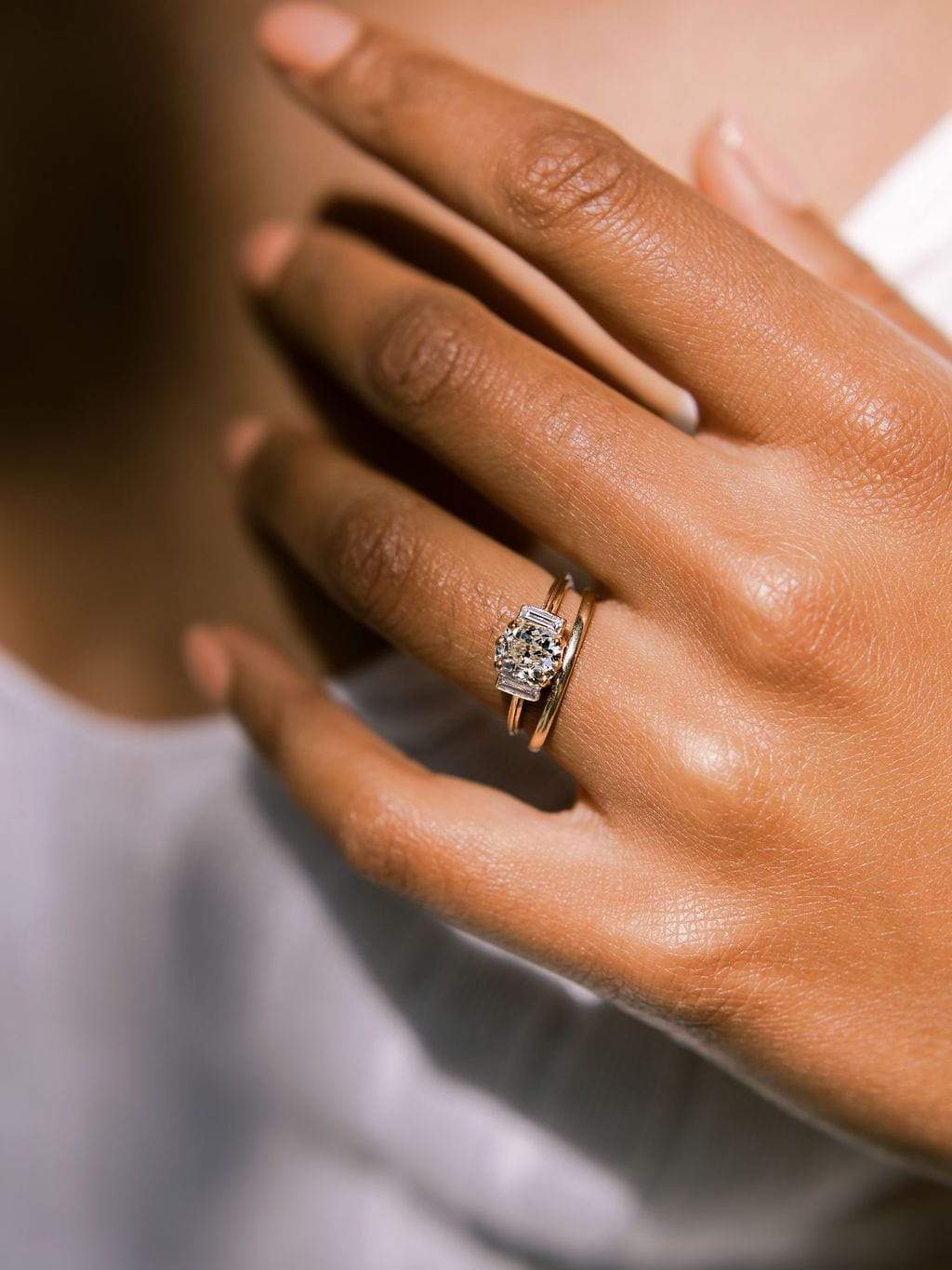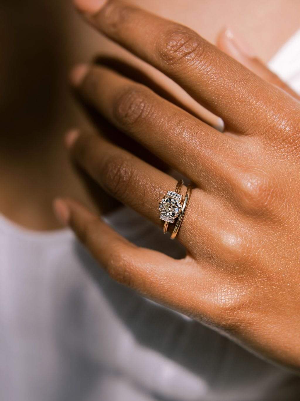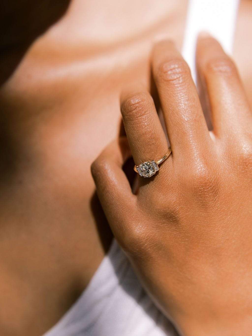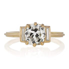 The Petra 1.35 ring is a vintage-inspired VB-made diamond engagement ring centering an authentically antique diamond. The ring centers a GIA certified 1.35-carat old mine cut diamond of I color, VS2 clarity. The stone is set in an 18-karat yellow gold setting. To each side of the center stone is a vertically-set diamond baguette. The ring is currently size 6 and can be resized!