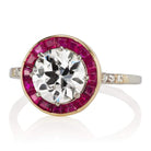 The Maeve ring is an authentic vintage engagement ring from the Art Deco Era circa the 1920s. The ring centers a GIA certified 1.71-carat old European cut diamond of H color, VS2 clarity. The stone is set in a platinum setting with a halo of sixteen Calibré cut rubies around the center stone in an 18kt yellow gold channel setting. Three small diamonds are set into each of the shoulders of the ring. The ring is currently size 7 and can be resized!