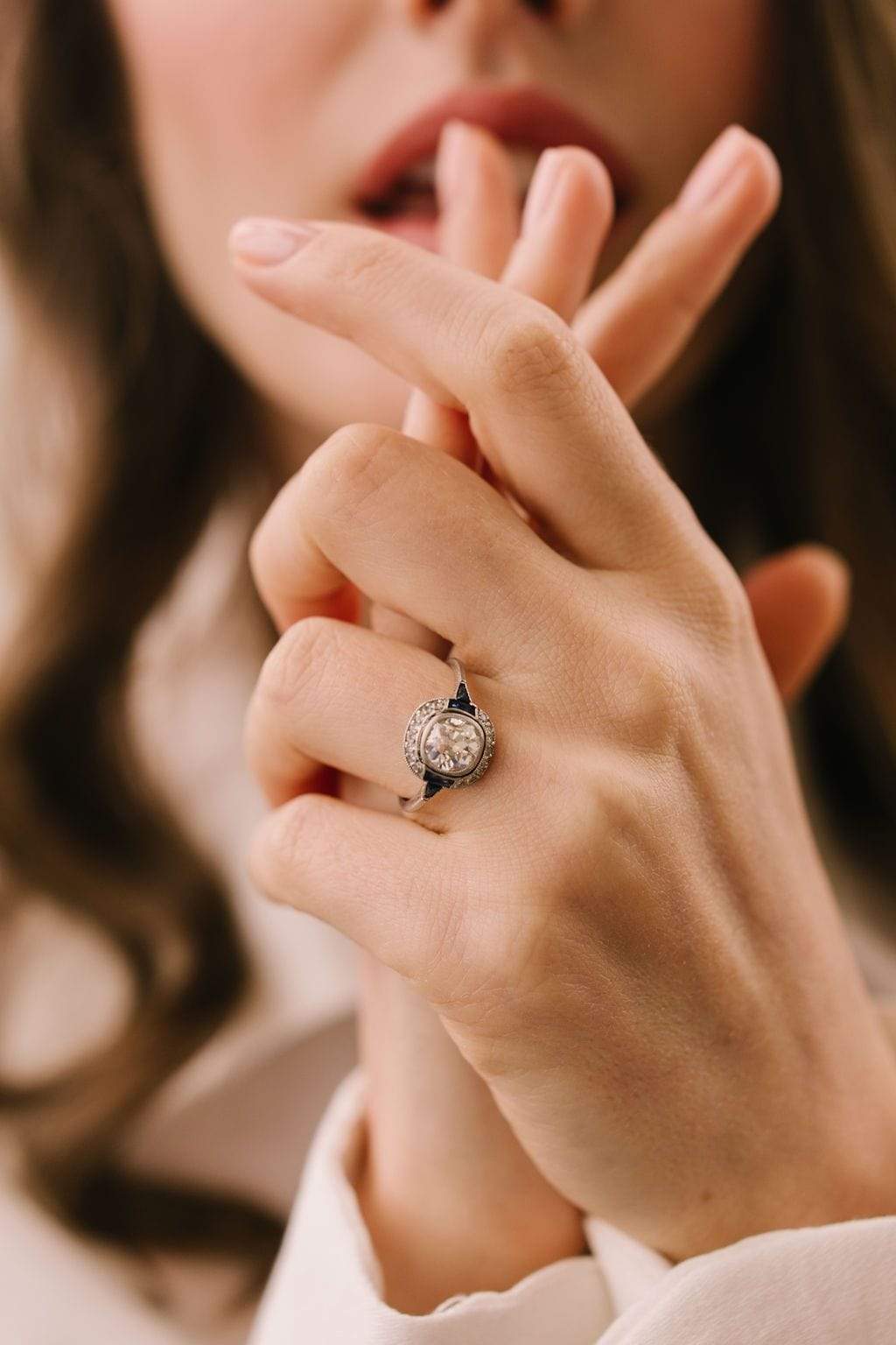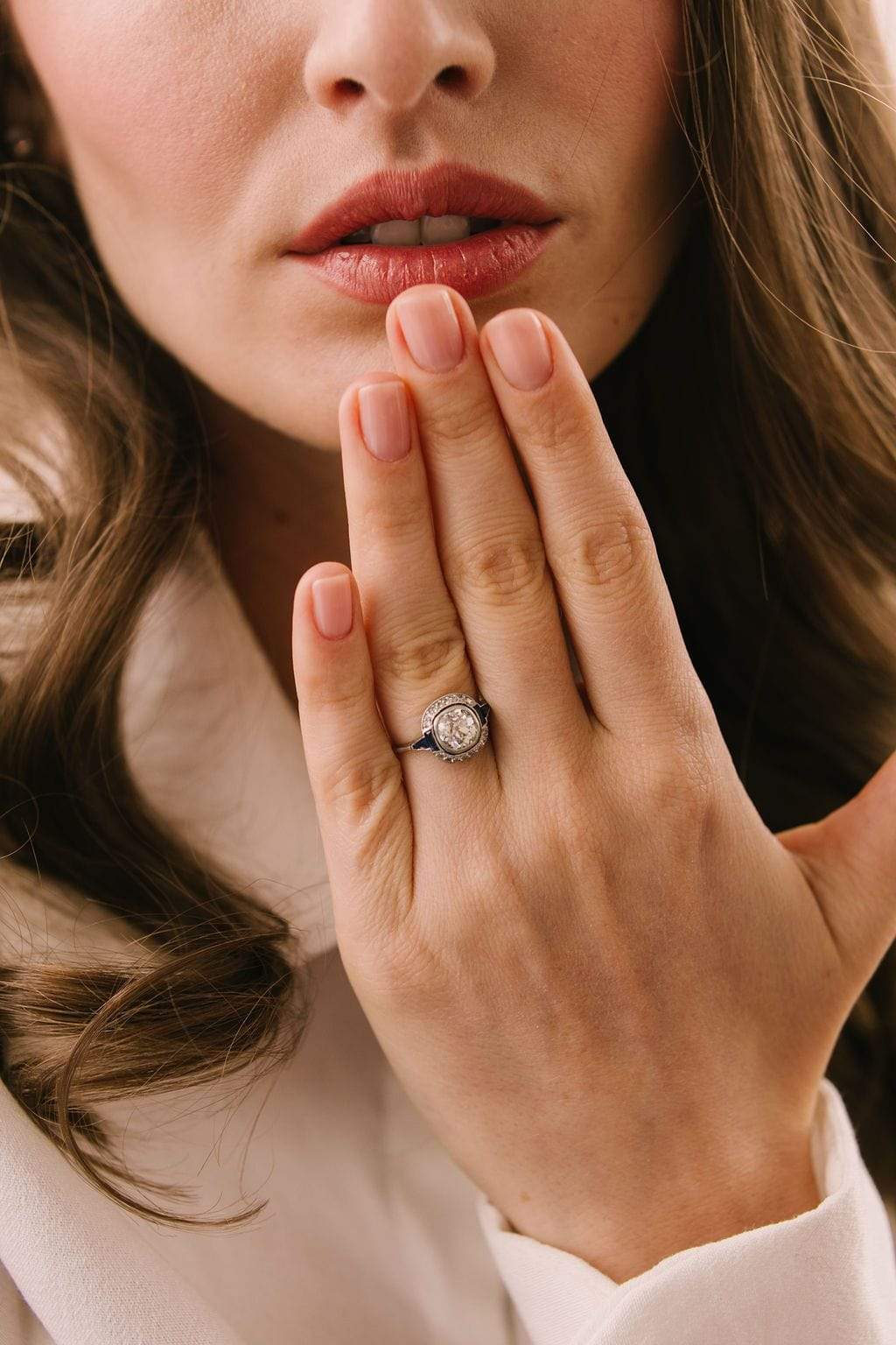 The Grey ring is an authentic Art Deco era engagement ring circa 1920! This Diamond & Sapphire Bezel Halo Engagement Ring centers a GIA Certified 1.27 carat old European cut diamond of K color, VS2 clarity. The diamond is bezel-set in a platinum ring with fine millegrain surrounding the stone. Sleek sapphires are set into the shoulders with a halo of 16 old European cut diamonds further accentuating the center stone! The ring is currently size 7.25 and can be resized!