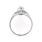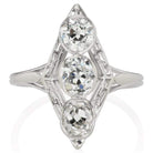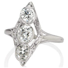 The Adonna Ring is a diamond shaped engagement ring from the Art Deco era, circa 1920! This beauty features 3 bezel-set old mine cut diamonds vertically set in a marquise-shaped platinum ring. The diamonds combine for approximately 1.55 carats of I-J color, VS2-SI2 clarity. The outline of the ring is a border of geometric metal work with a gorgeous split shank. The ring is size 7.5 and can be resized!