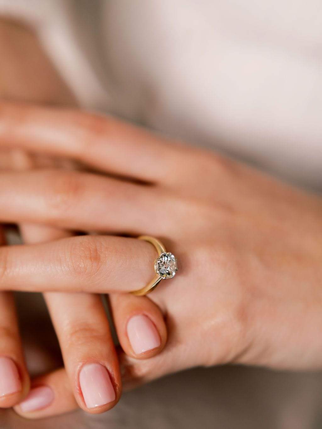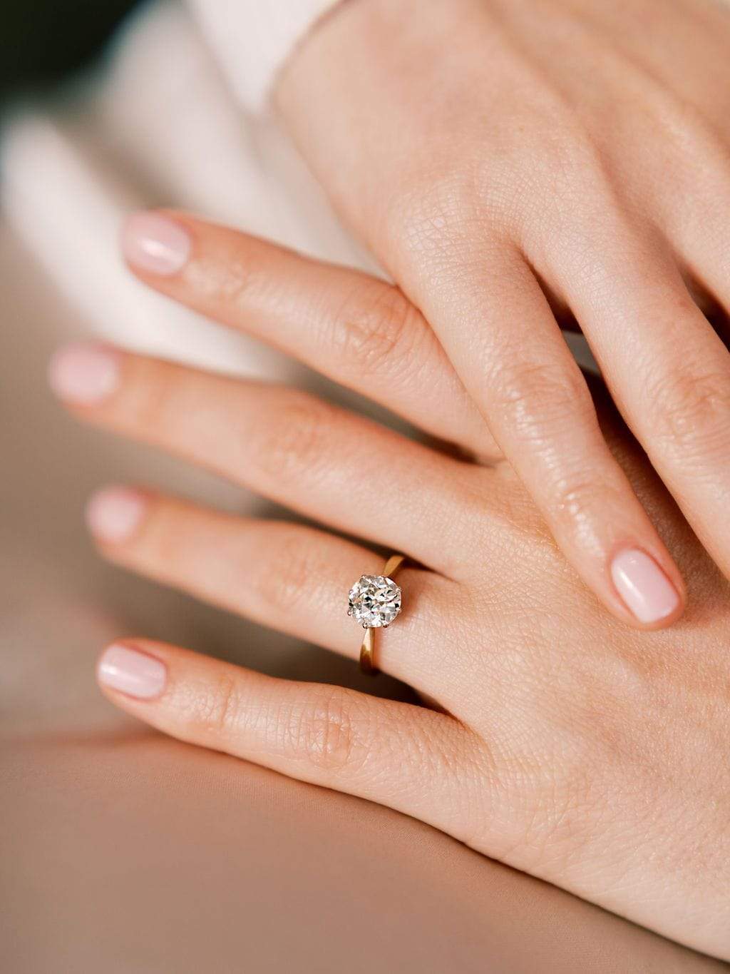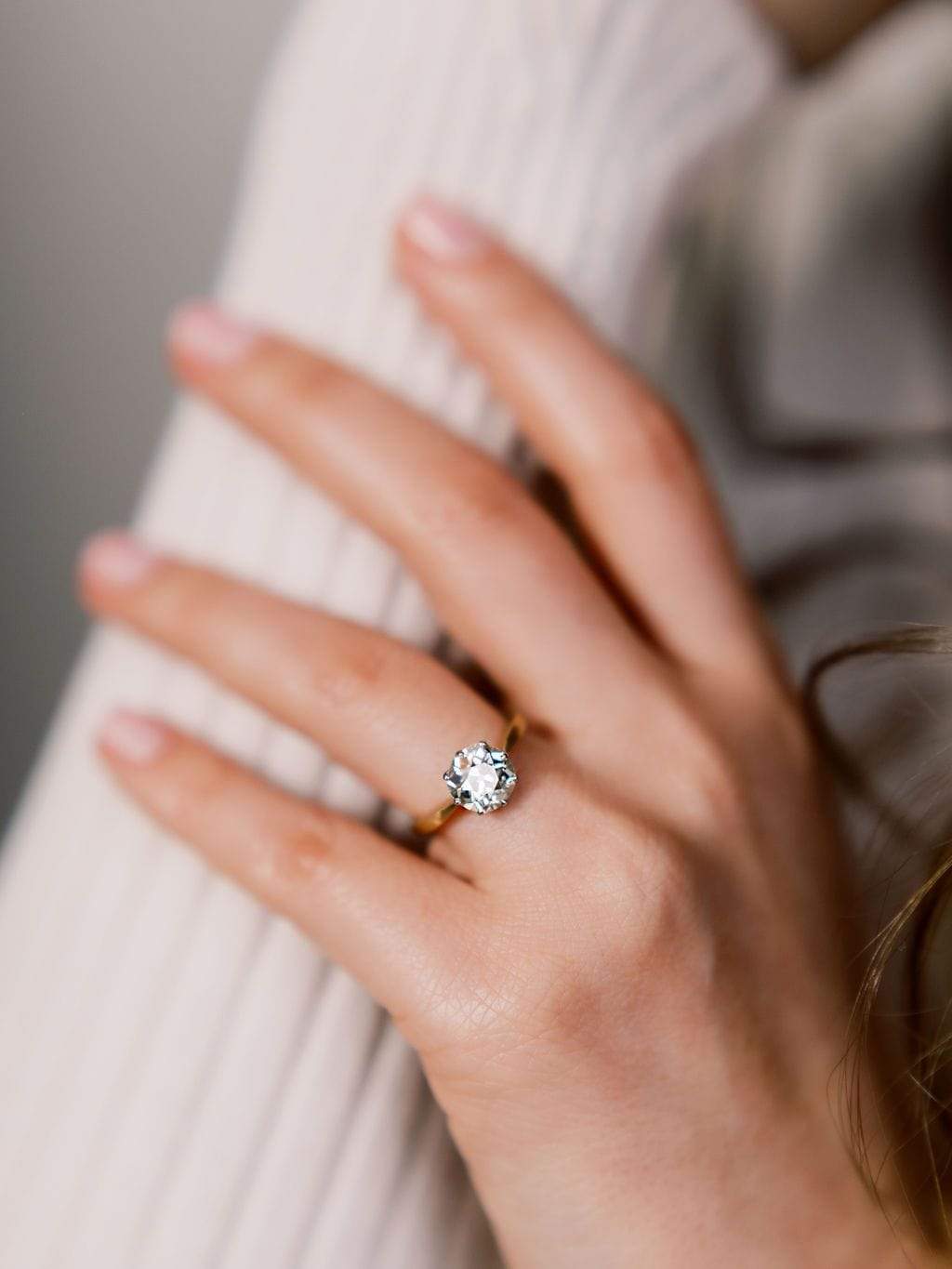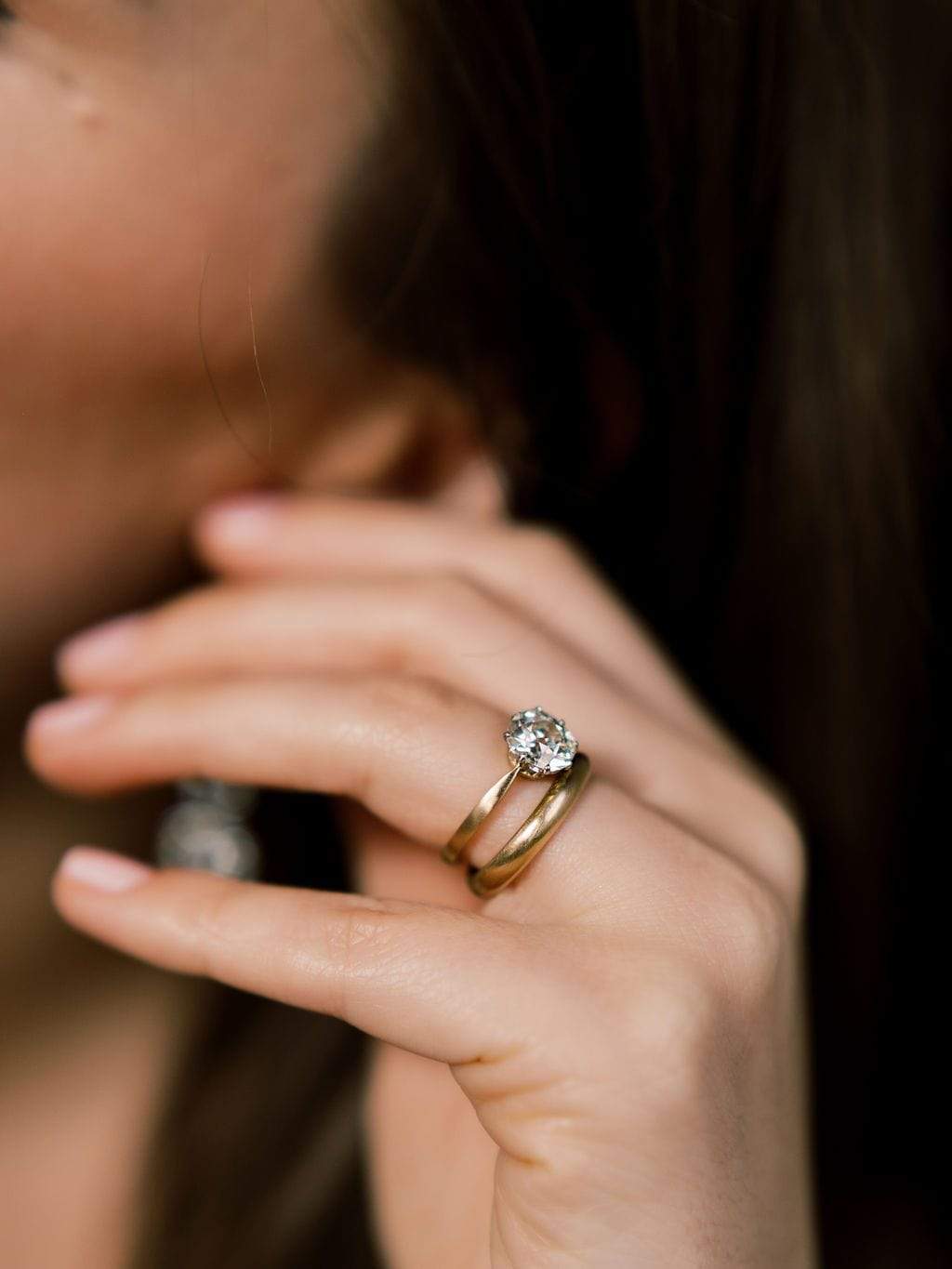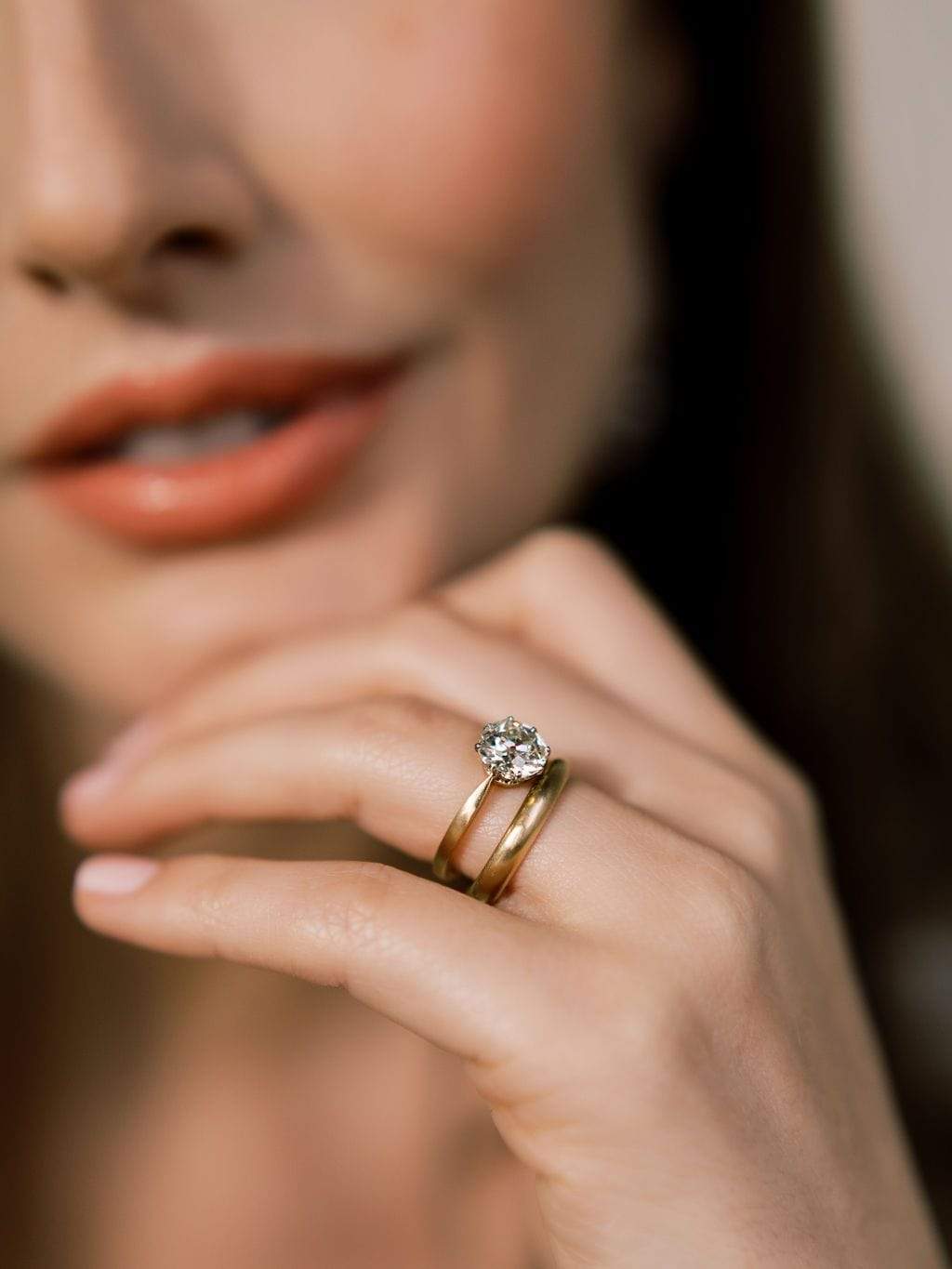 The Brooklyn 1.89 ring is a vintage-inspired VB-made diamond engagement ring. The ring centers a GIA certified 1.89-carat old European cut diamond of M color, VS2 clarity. The stone is set in an 8-prong platinum basket with an 18 karat yellow gold band. The ring is currently size 5.5 and can be resized!