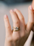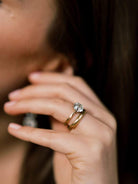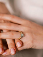 One of our perennial favorites! We love this style for its twist on a classic. A simple solitaire made a hair more bold with a squared, tapered band.