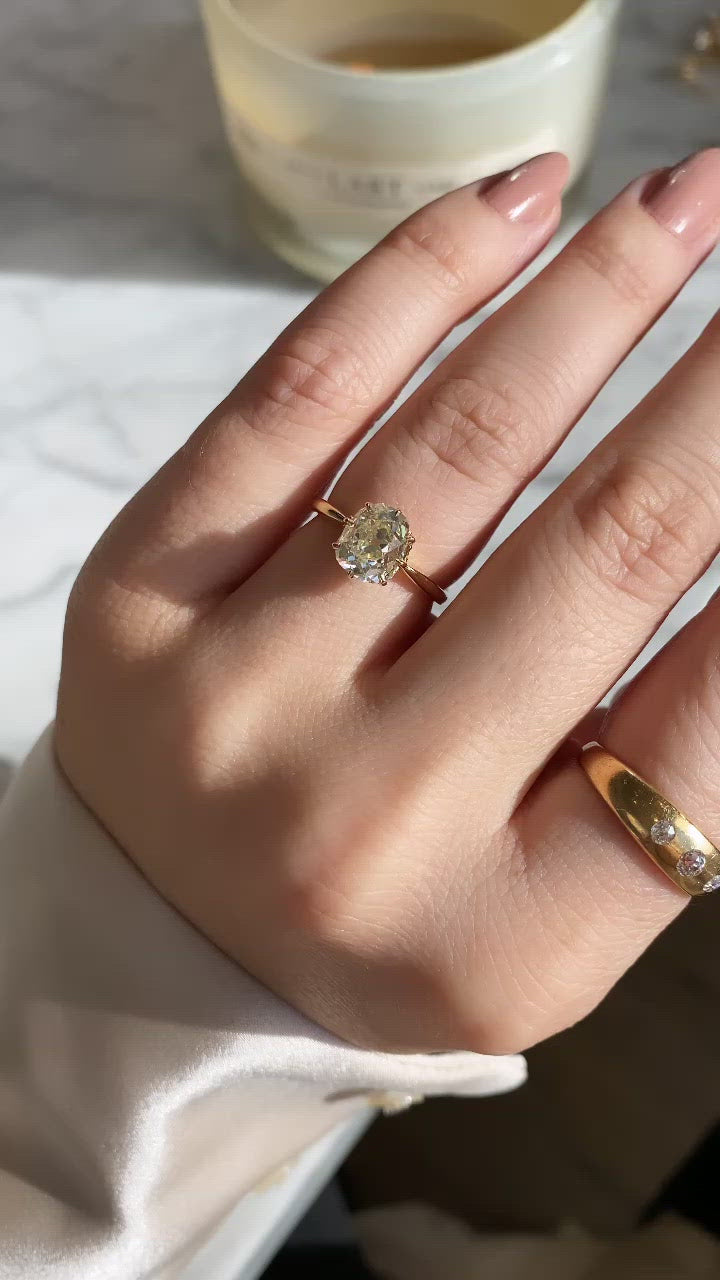 The Zara 2.24 ring is a VB original design made right here in NYC using an authentically antique diamond. The ring centers a GIA certified 2.24-carat old mine cut diamond of O-P color, SI1 clarity. The stone is set in an 8-prong 18 karat yellow gold setting with a slightly tapered band. The ring is currently size 6.25 and can be resized!